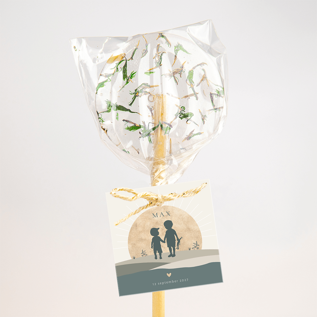 Lief labeltje in het vierkant met silhouetje van twee broertjes en een zonsondergang.