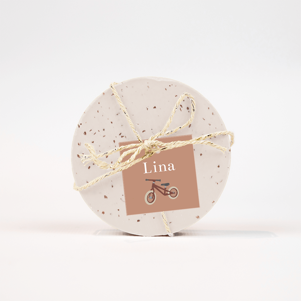 Dit grappige bruin-roze labeltje met vintage fietsje past goed bij het geboortekaartje van jullie dochter. De naam staat in hippe letters in wit, pas deze zelf eenvoudig aan in de online editor, zo gedaan!