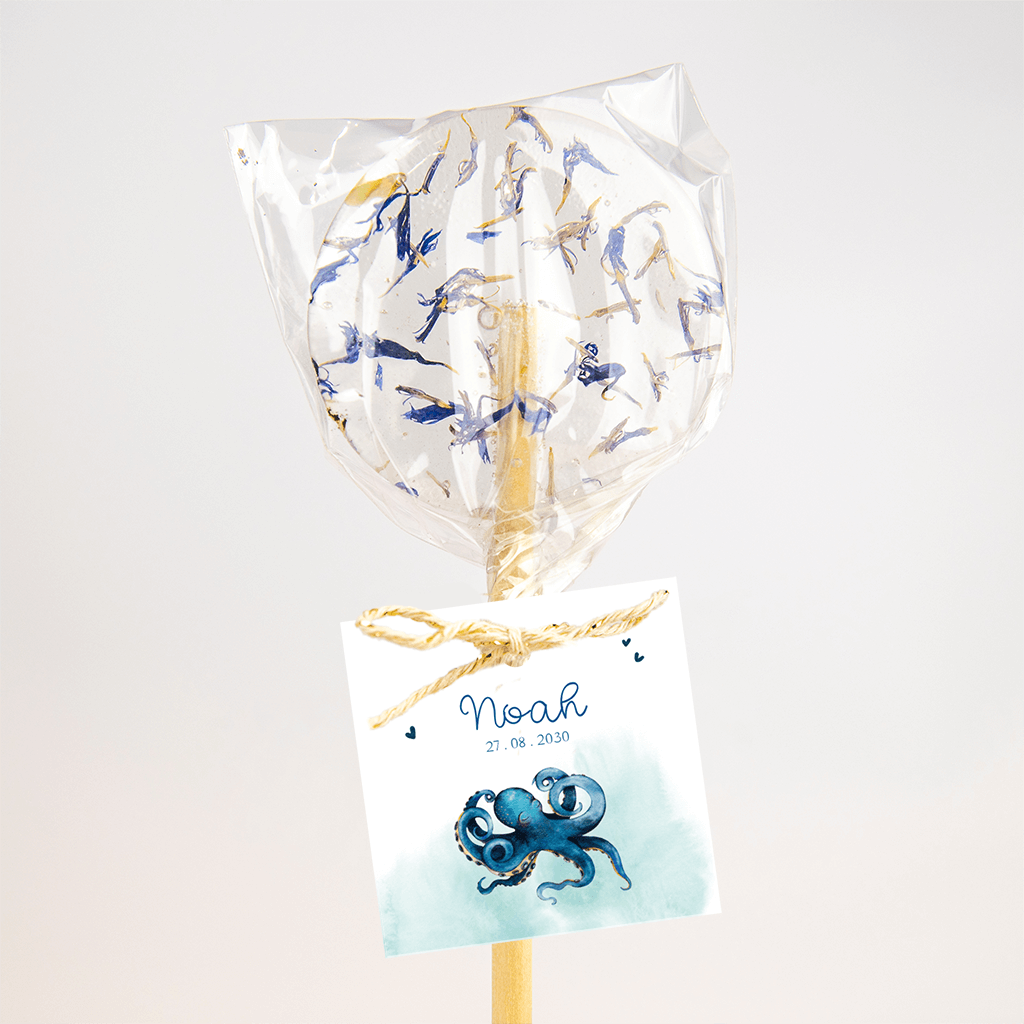 Lief labeltje met aquacolour octopus en hartjes om je geboortekaartje of doopsuiker te versieren. De afmeting van het labeltje is 40x40 mm.