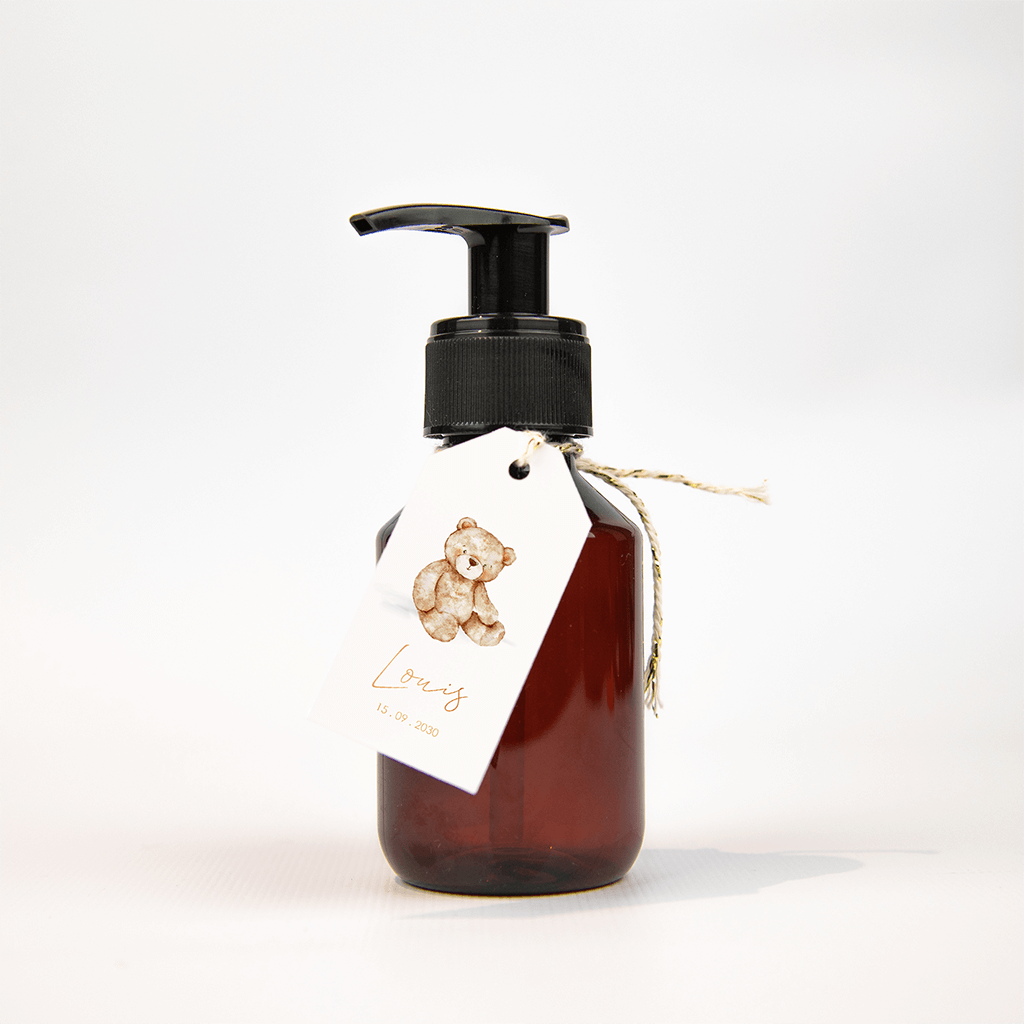 Schattig labeltje met een teddybeer in beige. De naam van de kleine staat in luxe hoogglans, mooi label voor de doopsuikers, afmeting 30x60mm, op coated karton, 18 stuks.