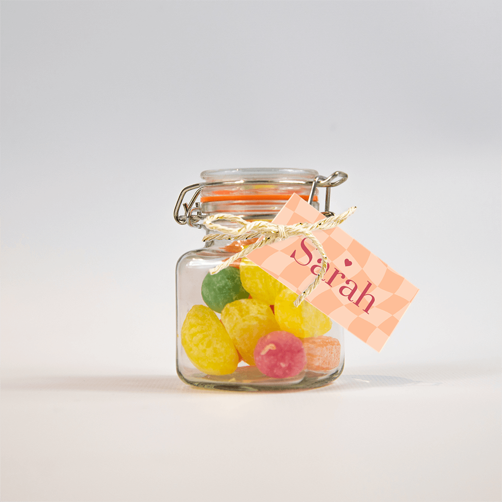 Dit labeltje past perfect bij het geboortekaartje met het gegolfde ruitjespatroon in twee kleuren oranje. Boven de naam in rood staat een lief hartje.