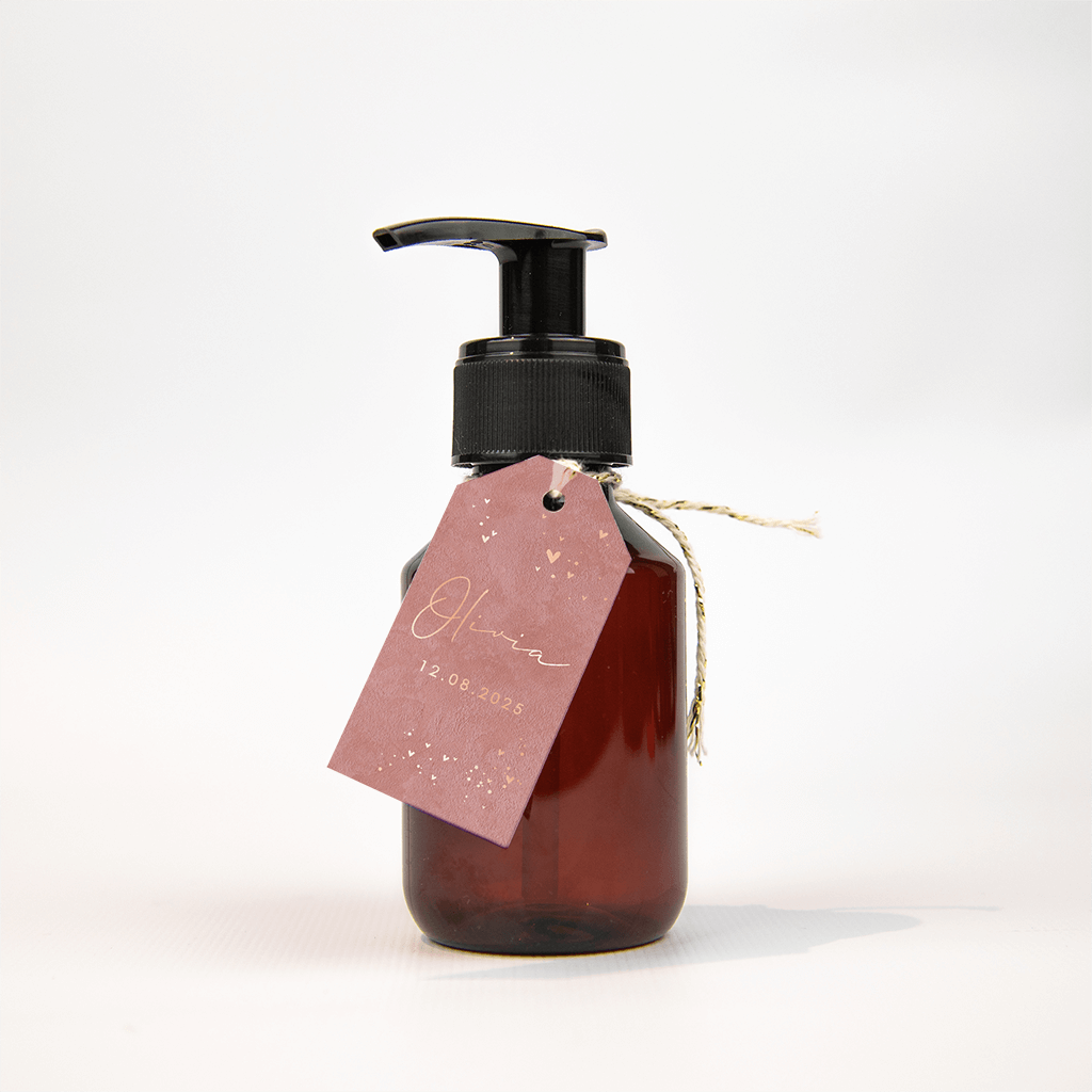 Een prachtig label in een mooie roze velvet-look. De roségouden hartjes maken het helemaal af. Perfect als toevoeging aan doopsuikers!