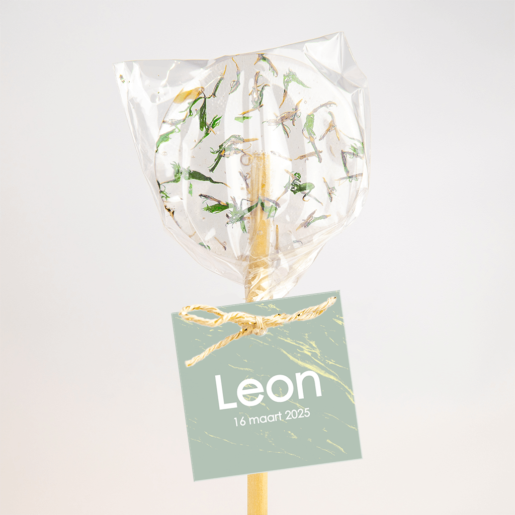Een hip labeltje bij het geboortekaartje van jullie zoontje! Op de stoere groene marmerachtergrond komt de naam in stoere letters mooi naar voren. Pas eenvoudig zelf de naam en geboortedatum aan in de online editor.