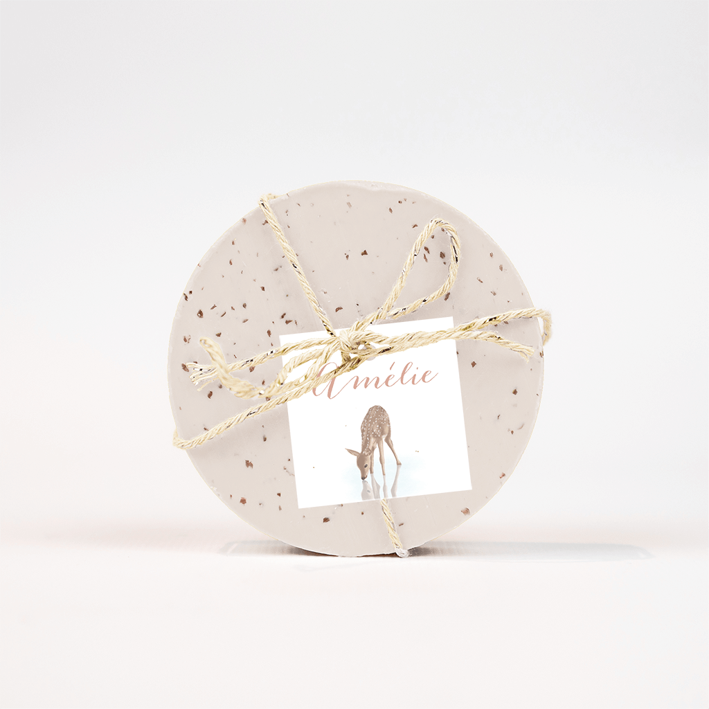 Echt lief, dit bijpassende labeltje in de stijl van het geboortekaartje van jullie dochter! Boven het hertje in pastelkleuren staat de naam in sierlijke roze letters, pas deze eenvoudig zelf aan en maak het labeltje persoonlijk in de online editor.