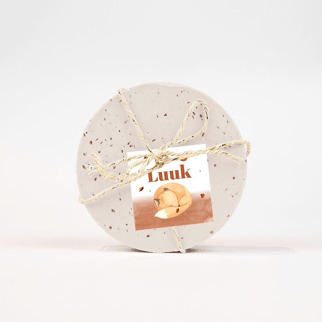 Een schattig labeltje die past bij de doopsuikers of het geboortekaartje van jullie zoontje of dochtertje. Op het labeltje staat een slapend vosje getekend tussen de blaadjes.Bekijk ook het bijpassende geboortekaartje.