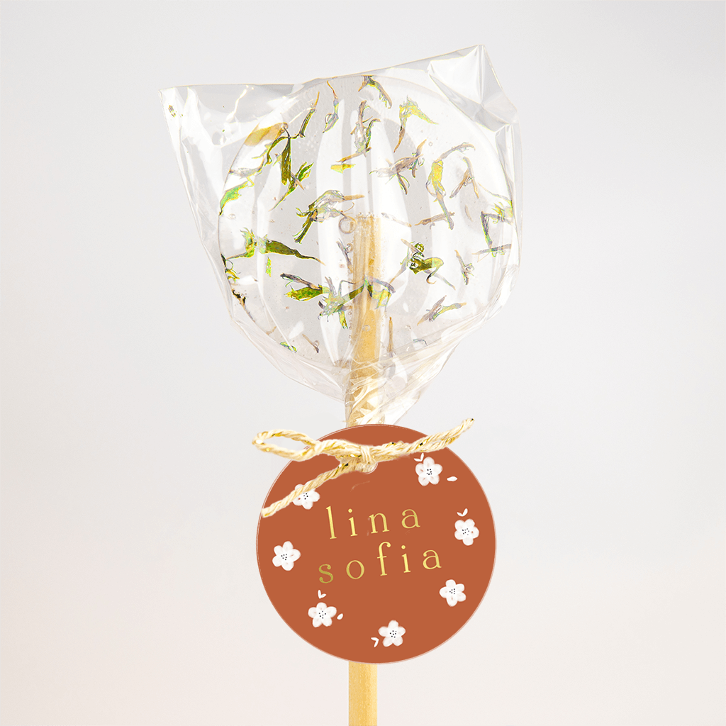 Vrolijk rond labeltje in roodbruin met schattige witte bloementjes en de naam van jullie kleintje in goudfolie gedrukt.