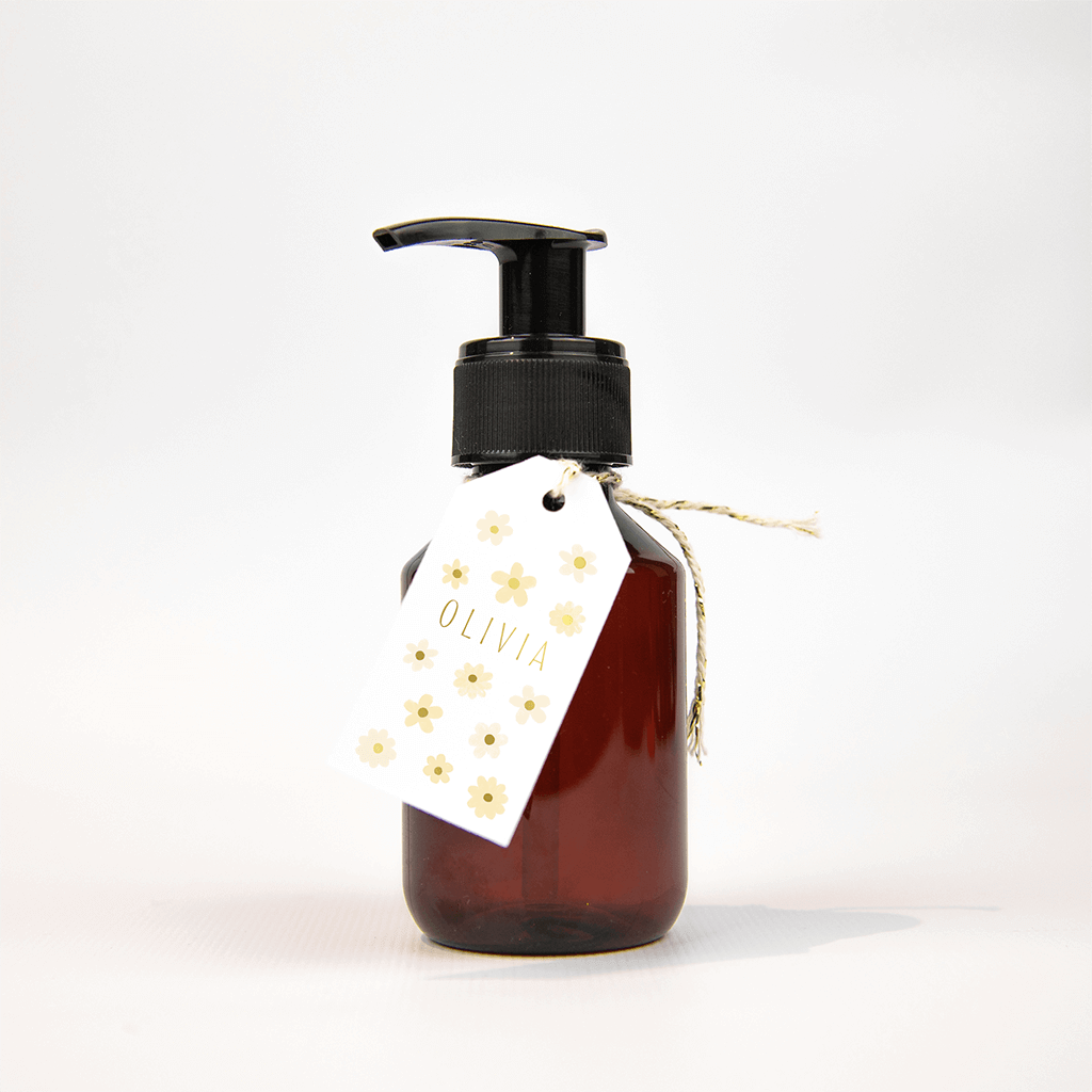 Zomers labeltje met gele bloementjes en naam in goudfolie - 18 stuks