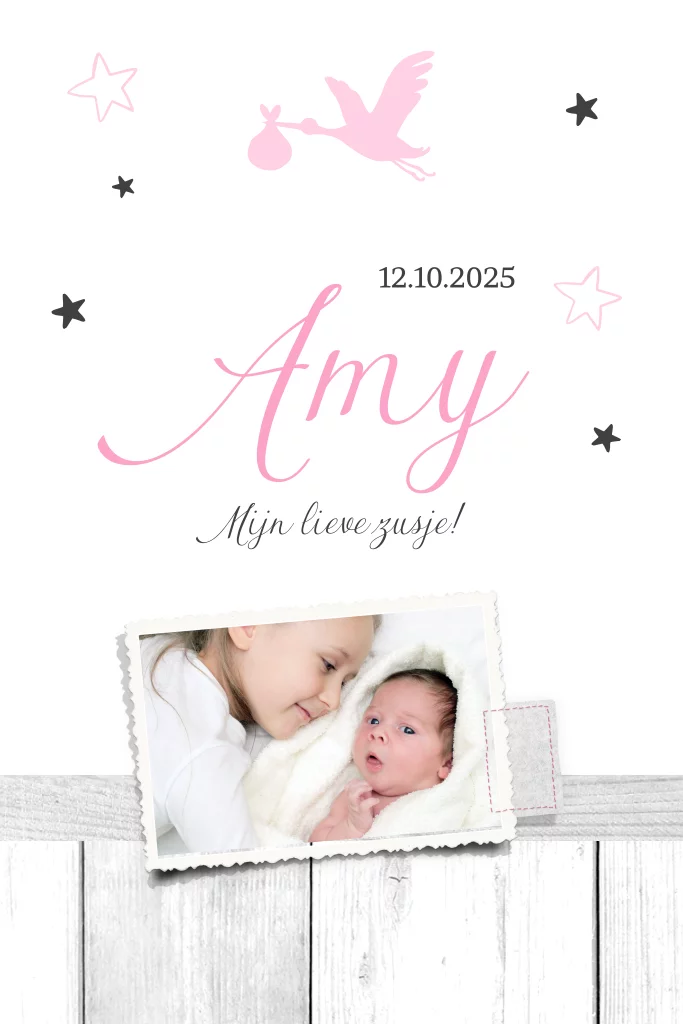 Lief geboortekaartje voor een meisje met het silhouet van een ooievaar in roze, kleine sterretjes en houtlook onderaan het kaartje. Voeg een leuke foto toe in het kader, schrijf je eigen teksten in de online editor en combineer het kaartje met een bijpassende enveloppe!
