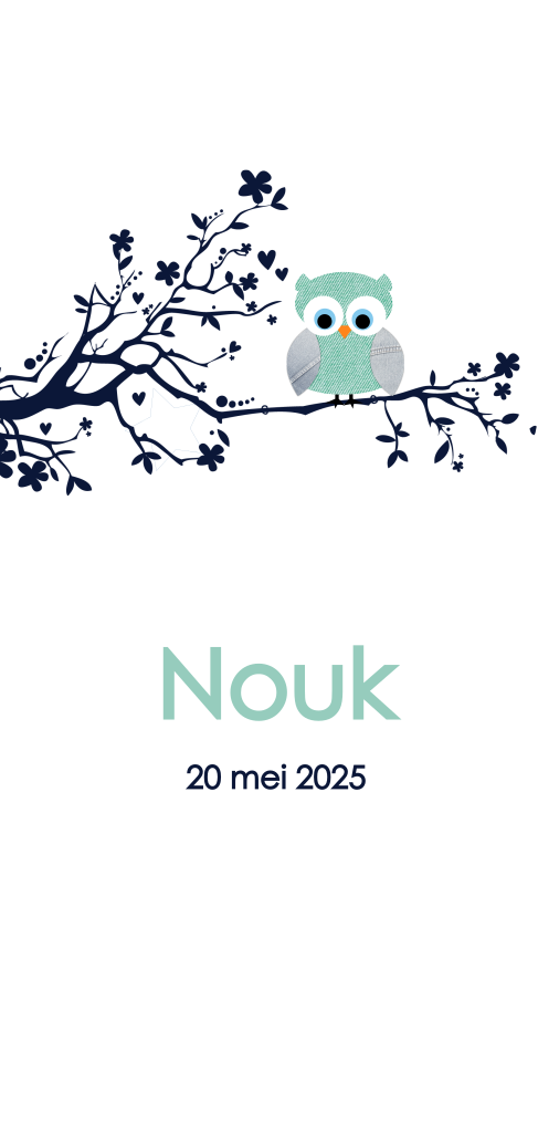 Hip, langwerpig geboortekaartje met een grappig uiltje op een boomtak met bloemetjes. Mintgroen is de kleur die terugkomt in de naam. Leuk voor een meisje! Pas de tekst eenvoudig zelf aan in de online editor, zo gedaan.!