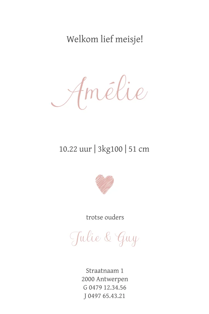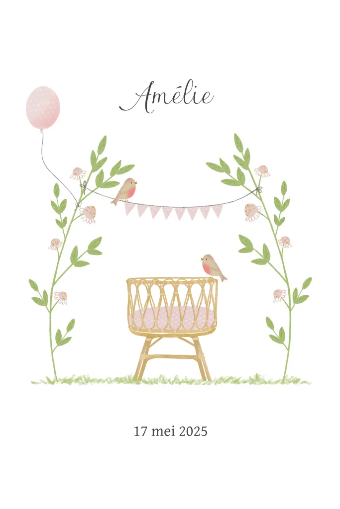 Lief geboortekaartje voor jullie dochter met een wiegje, vogeltjes, takjes, vogeltjes en een ballon in roze en groen. Het kaartje is helemaal naar wens aan te passen in de online editor.