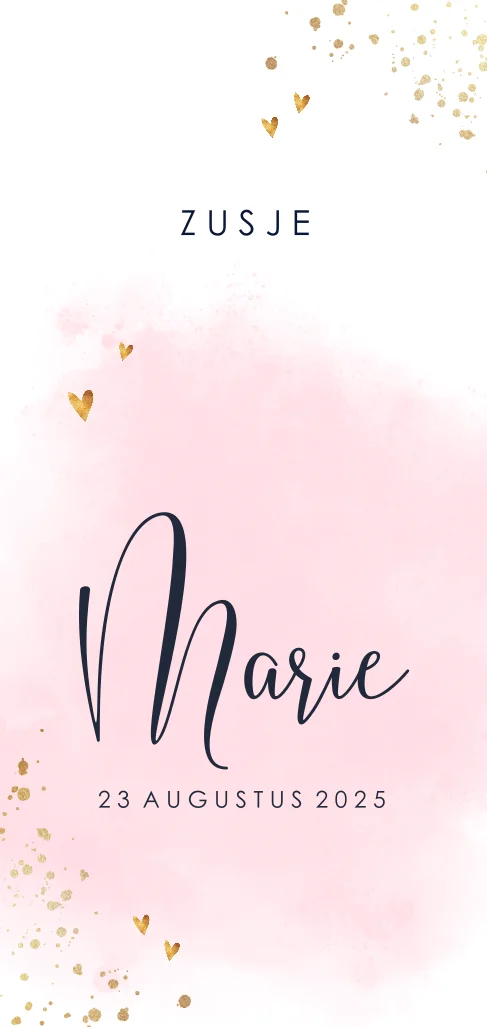 Zo lief dit geboortekaartje voor een meisje! Op de achtergrond een roze aquarelvlak en kleine goudkleurige hartjes. Maak het kaartje persoonlijk in de editor: kies je lettertype, plaats je teksten en bestel een proefdruk. Heel gaaf op parelmoer papier met bijpassende envelop.Bekijk ook ons bijpassend babyborrelkaartje.