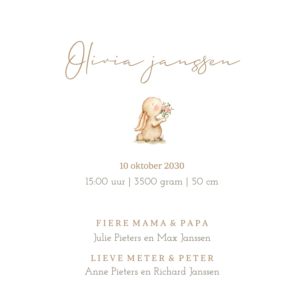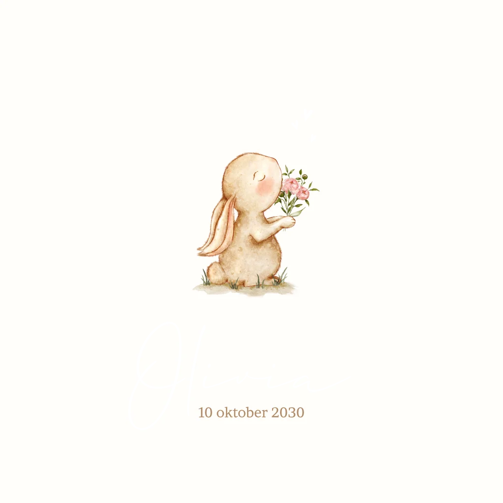 Schattig geboortekaartje met beige achtergrond en goudfolie tekst. Het konijntje houdt een lief bosje bloemen vast wat het kaartje extra schattig maakt.