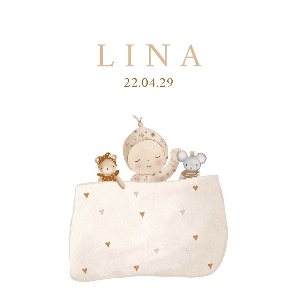 Een lief geboortekaartje om bij weg te dromen. Op het vierkante kaartje staat een illustratie van een baby die heerlijk ligt te slapen onder een hartjesdeken. Pas de kaart naar eigen wens aan in de online editor, zo gedaan!