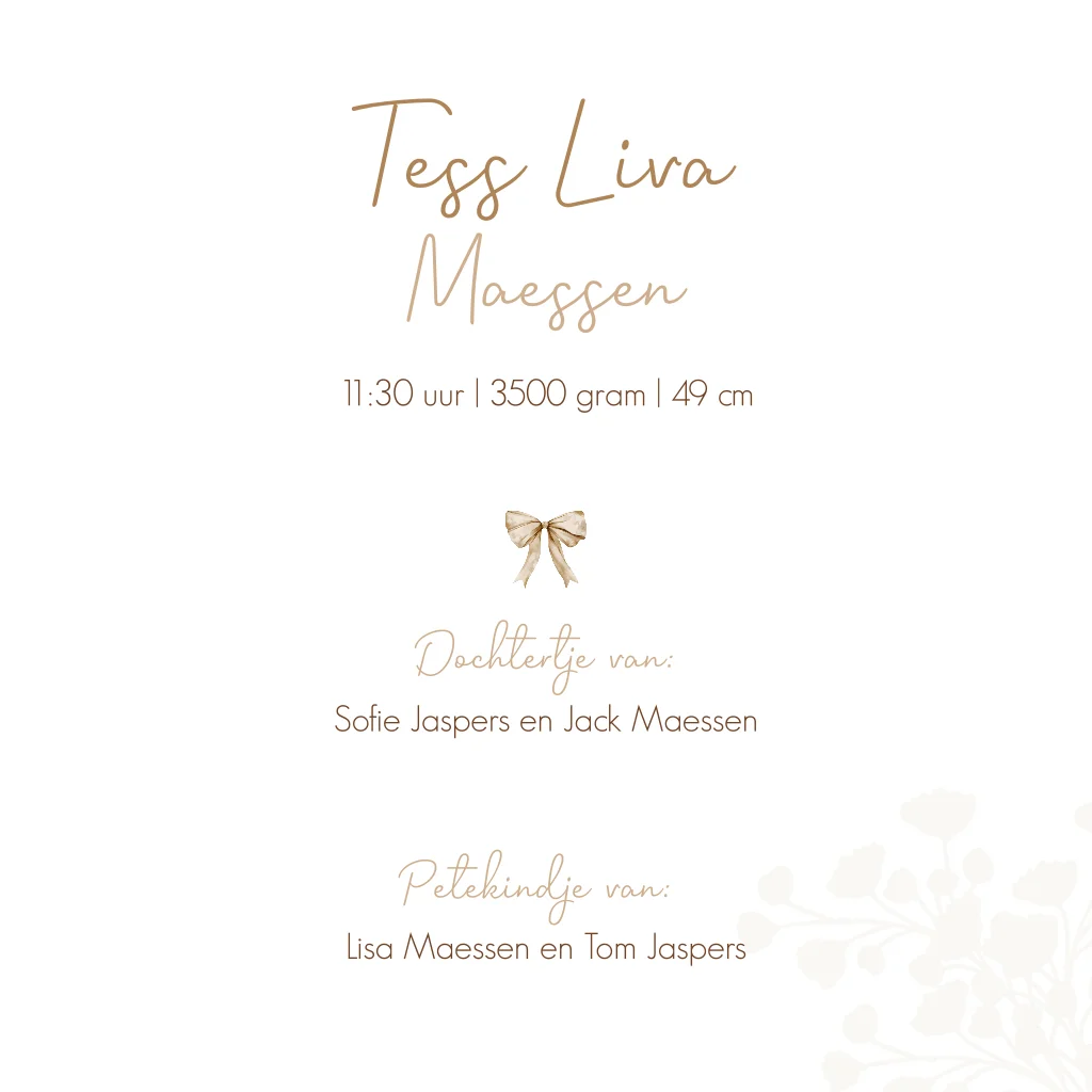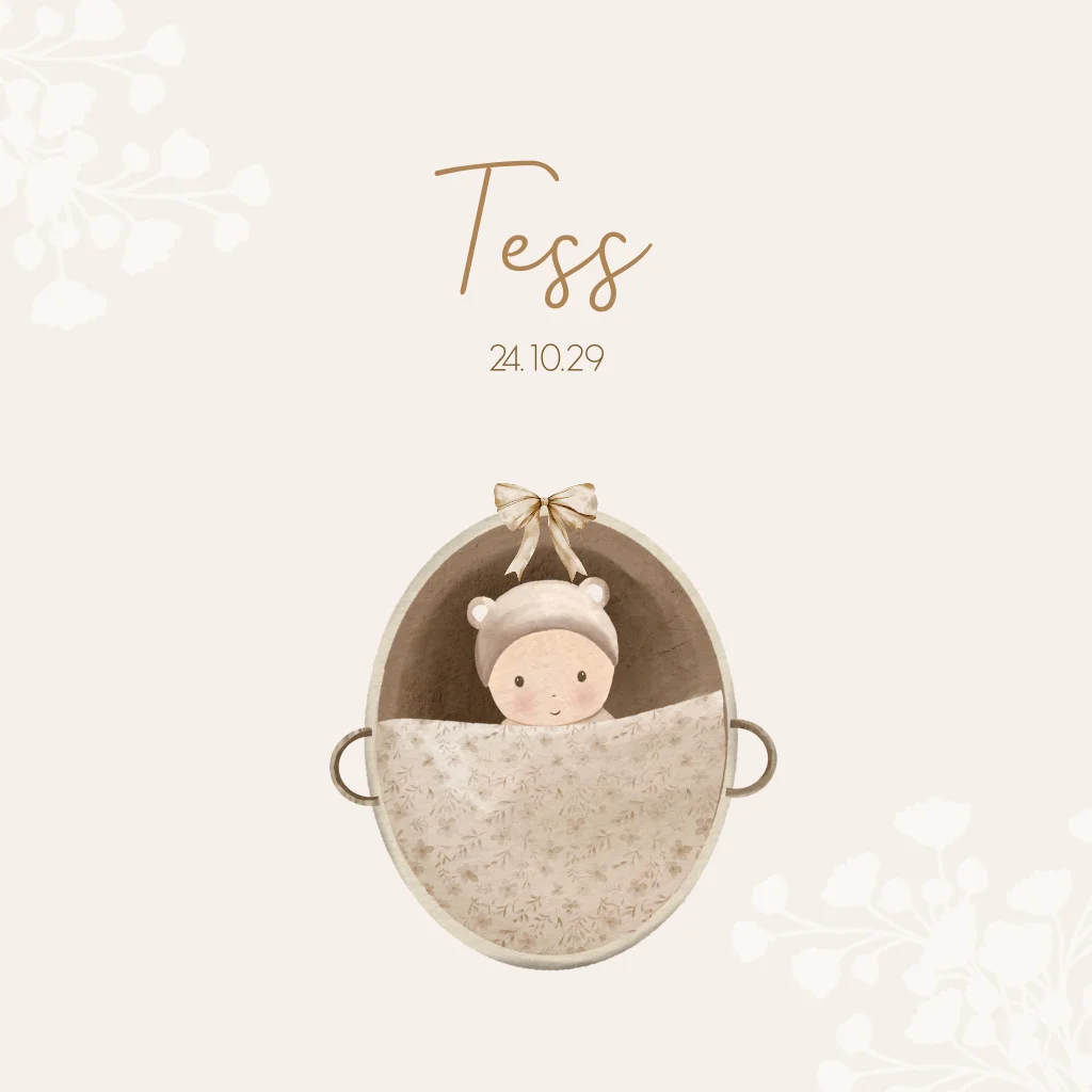 Super schattig geboortekaartje voor een meisje. Op de zacht beige achtergrond zijn subtiele witte bloemen te vinden. Op de voorgrond staat een lieve afbeelding van een baby in een mandje. Kleur en lettertype is eenvoudig aan te passen in de online editor.