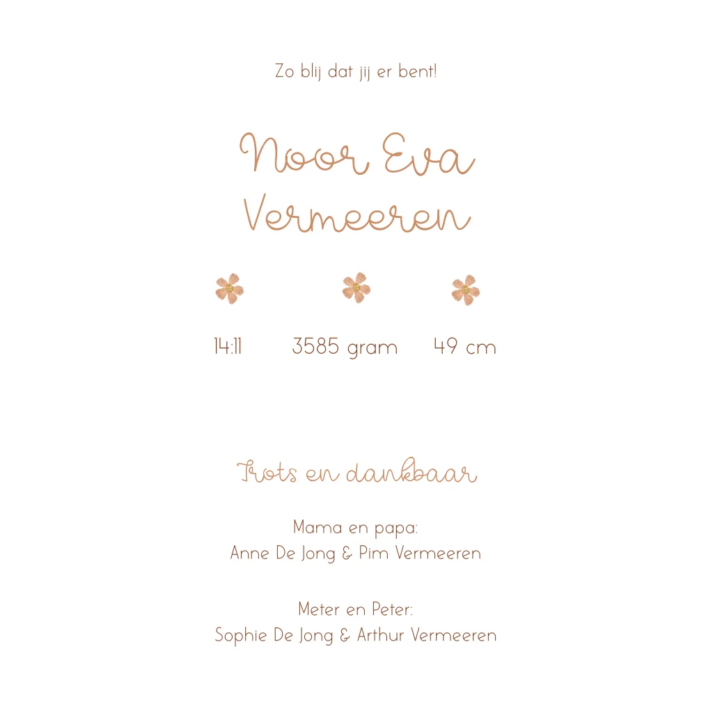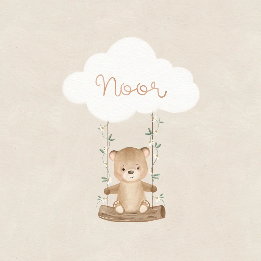 Schattig beige geboortekaartje voor een meisje: aan een wolk waar de naam in roségoudfolie staat hangt een schommel met takjes waar een lief beertje op zit. Pas de tekst naar wens aan in de online editor.