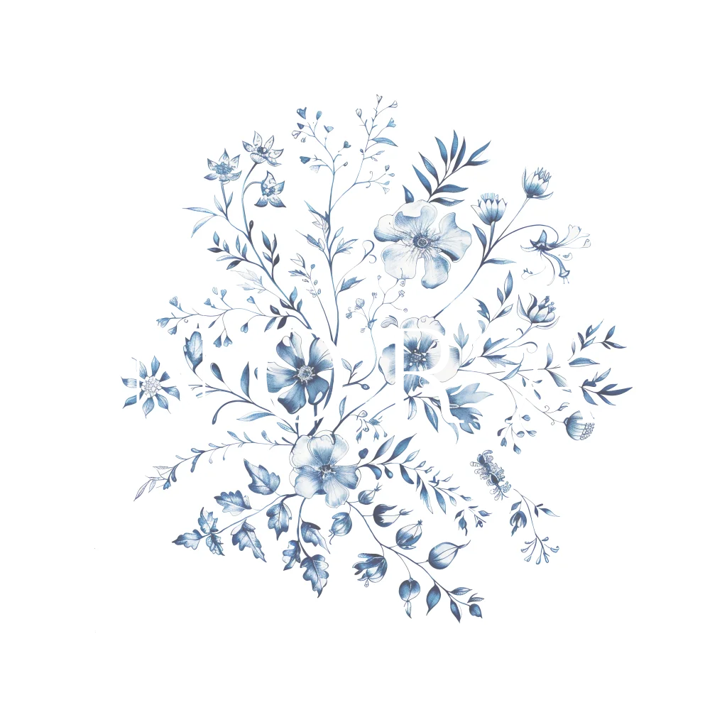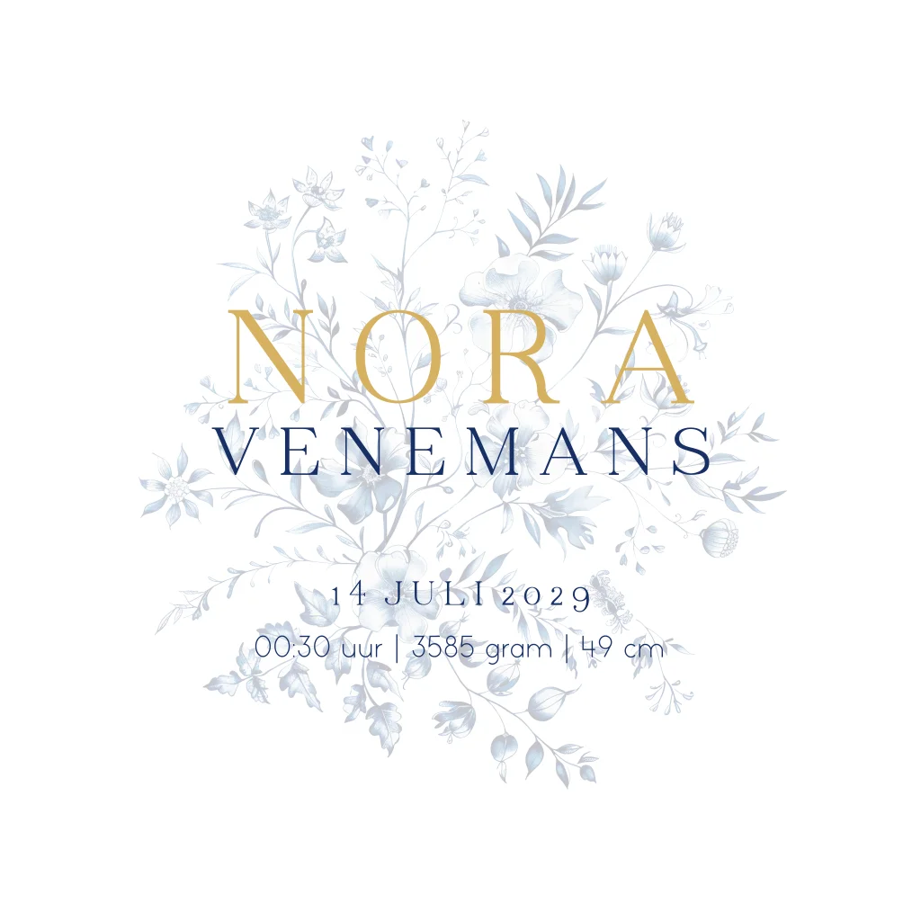 Geboortekaart bloemen blauw met goudfolie.