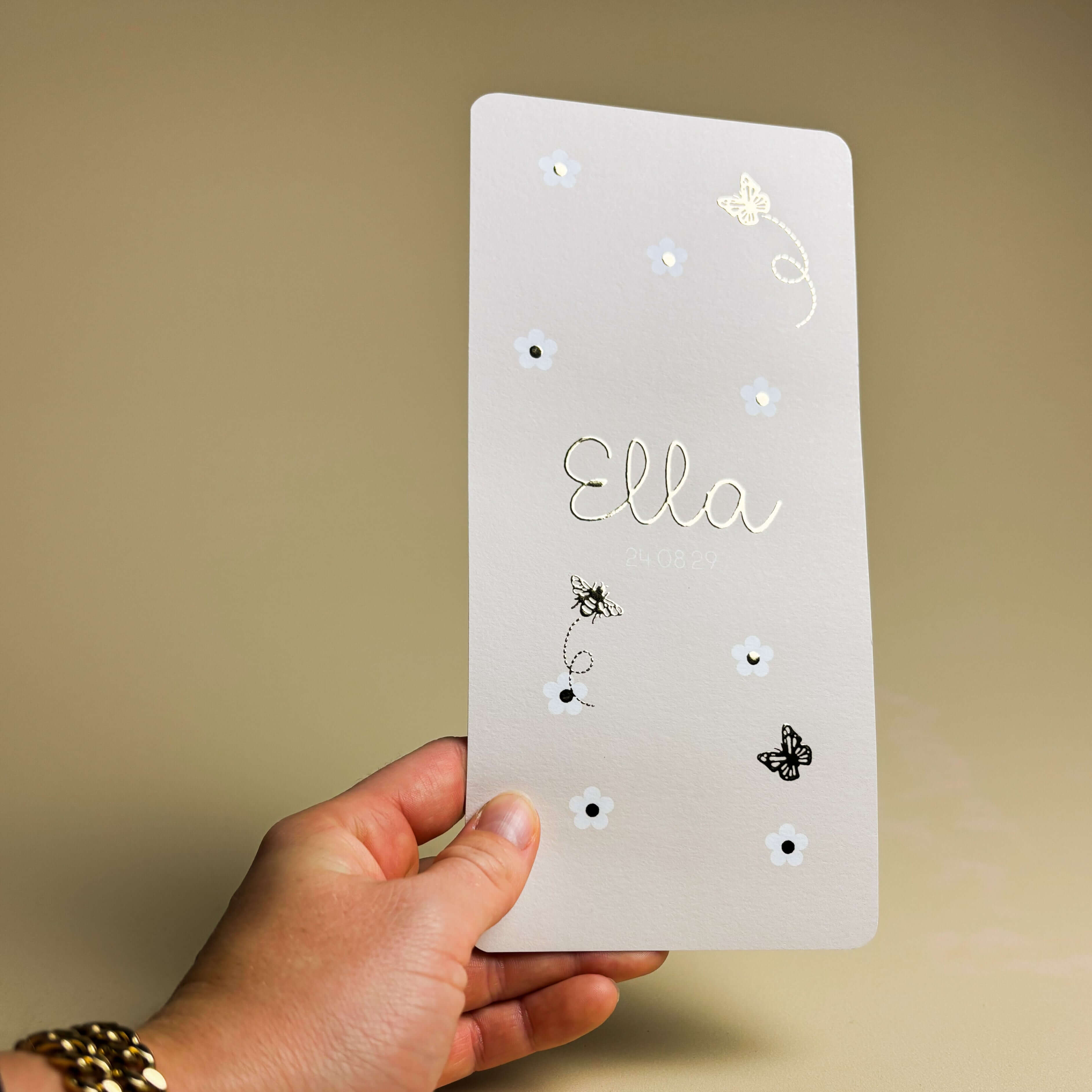 Lief geboortekaartje met bloemetjes en schattige vlinders en bij. De ronde hoeken en het goudfolie geven een prachtige afwerking. Pas de kaart naar eigen wens aan in onze online editor.