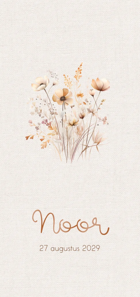 Geboortekaart linnen beige achtergrond en bloemen.