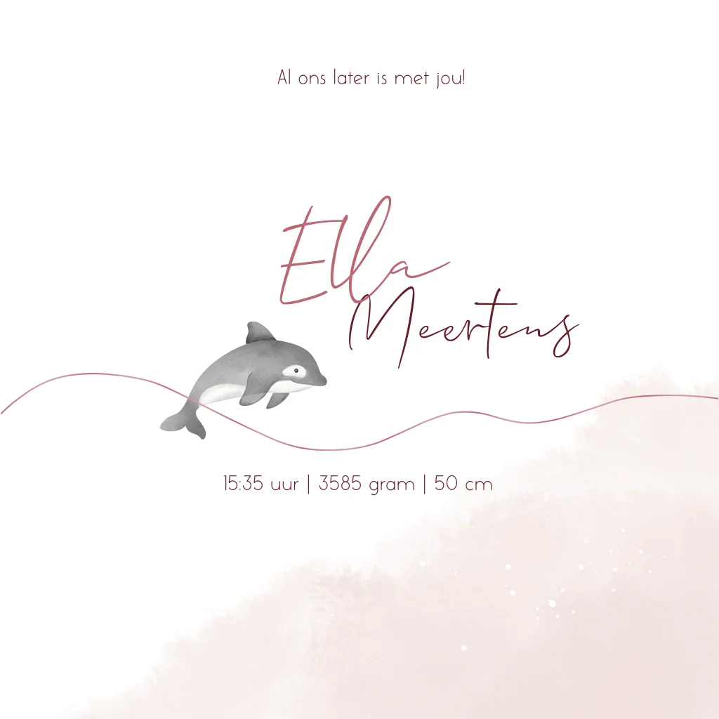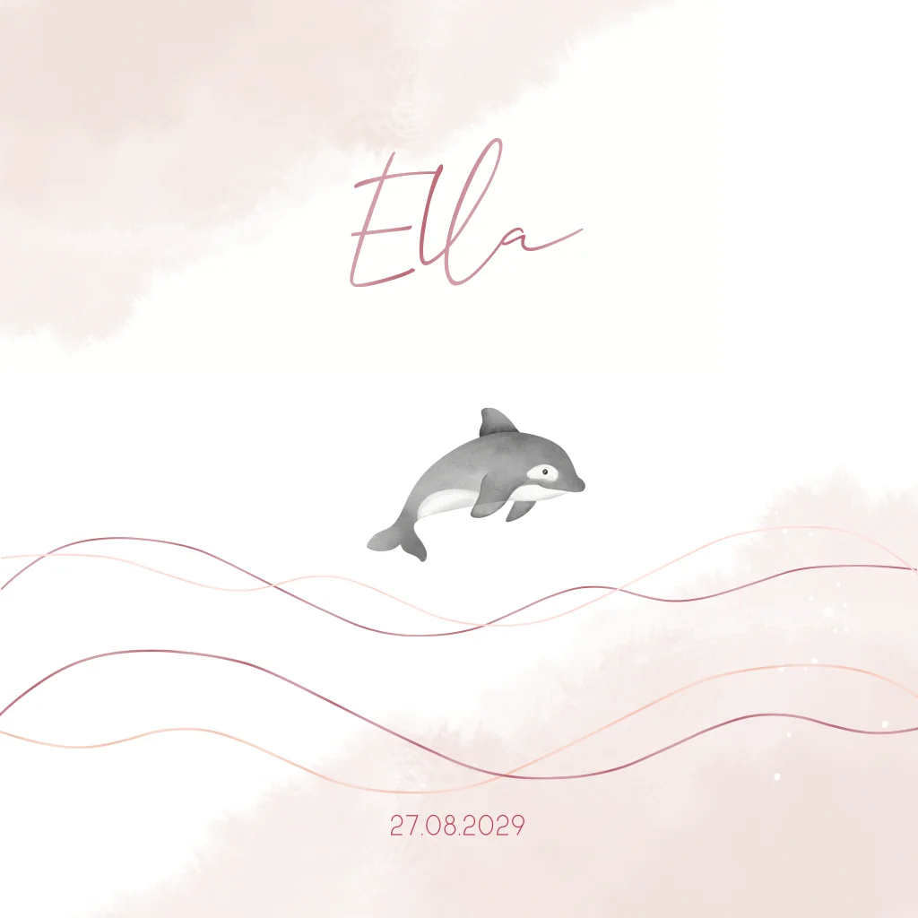 Lief geboortekaartje voor meisje. Op de roze met witte kaart zwemt een dolfijn in de golven. De naam van jullie dochter in hoogglans letters geven een mooi effect! Bekijk ook eens de bijbehorende producten.