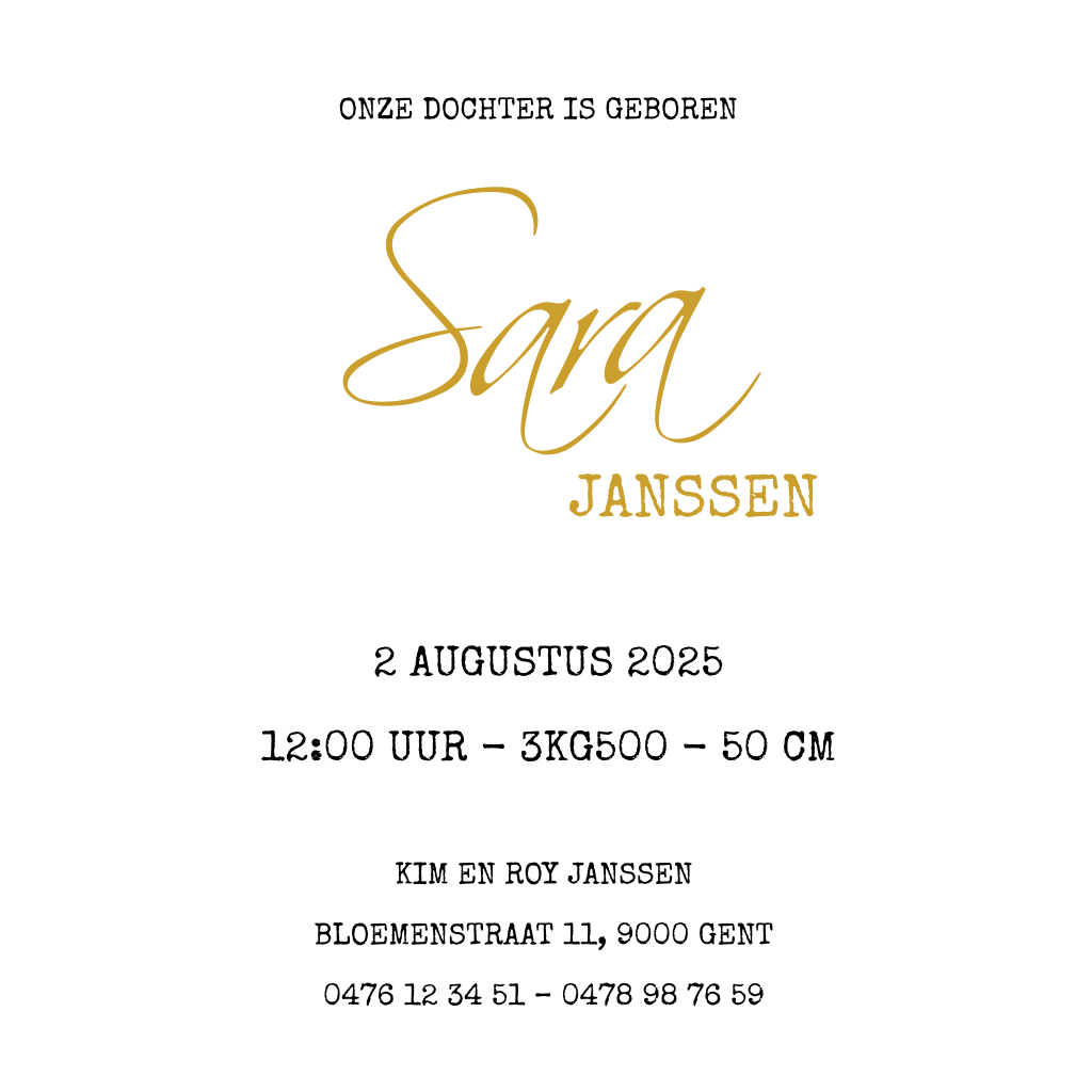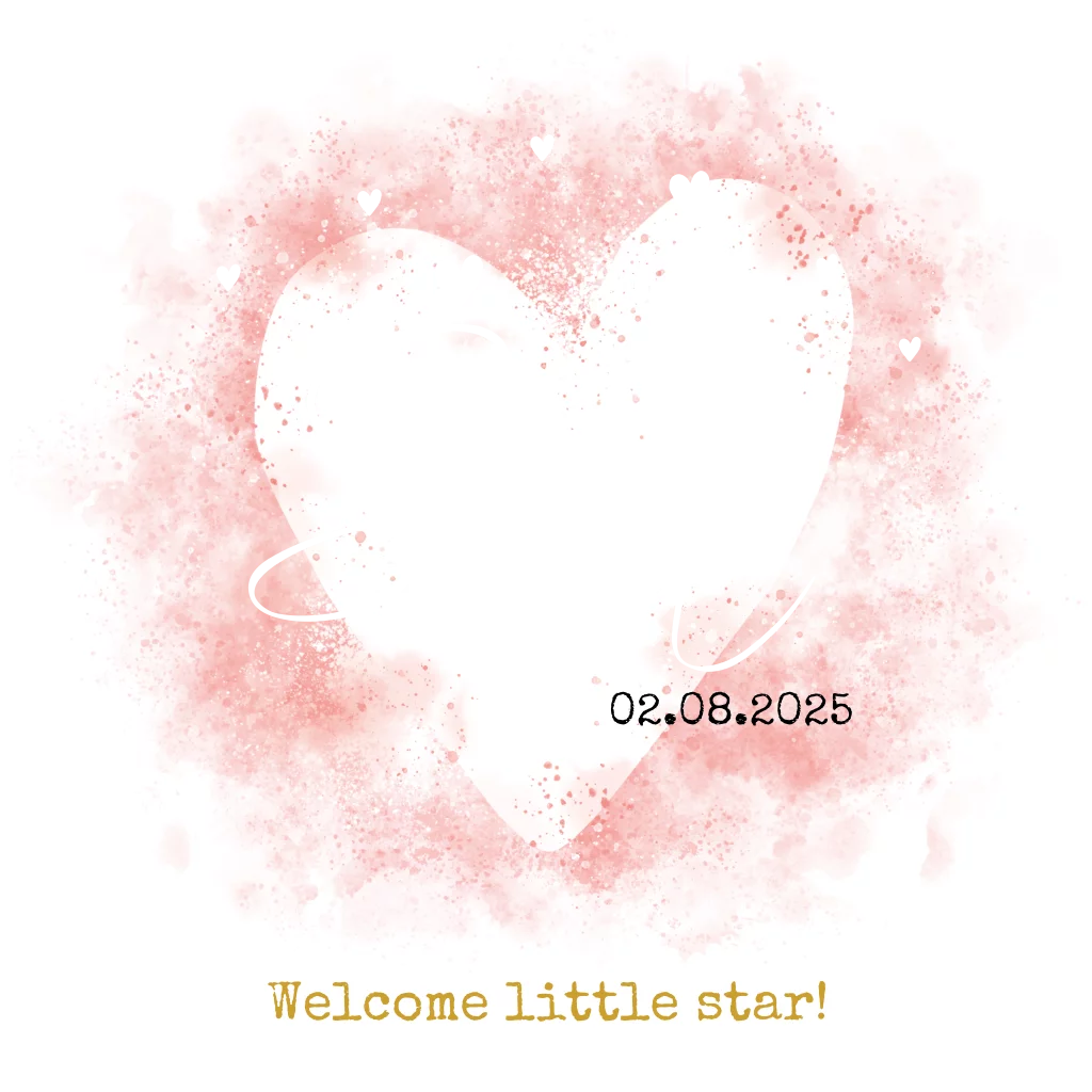 Ben je op zoek naar een geboortekaart die helemaal van deze tijd is? Deze kaart is door de roze waterverf achtergrond en elementen in goudfolie heel trendy! De tekst kan gemakkelijk worden aangepast in de online editor.