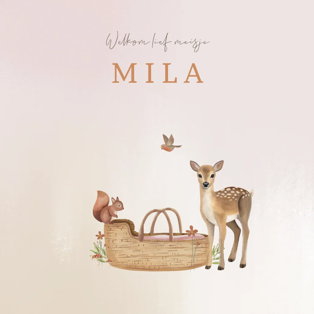 Geboortekaartje meisje met rieten mandje en bosdieren