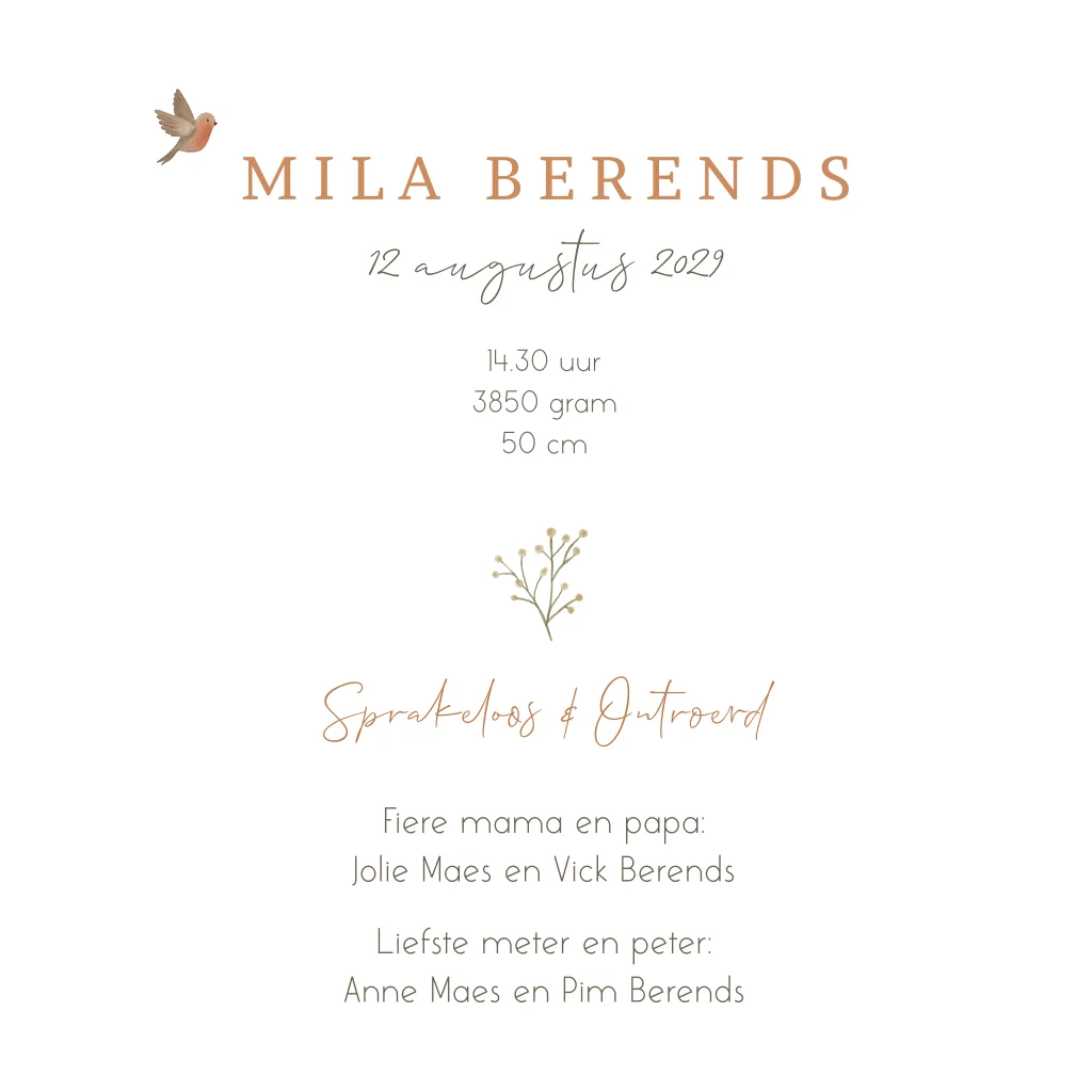 Superlief geboortekaartje voor een meisje, dit kaartje met roze waterverf achtergrond en bosdieren. Een eekhoorntje en hertje staan bij een rieten reiswiegje dat tussen de bloemetjes staat. Onder de naam vliegt een vrolijk roodborstje, het bosdieren thema komt ook aan de binnenkant van het kaartje terug bij de tekst, pas deze naar wens aan in de online editor.