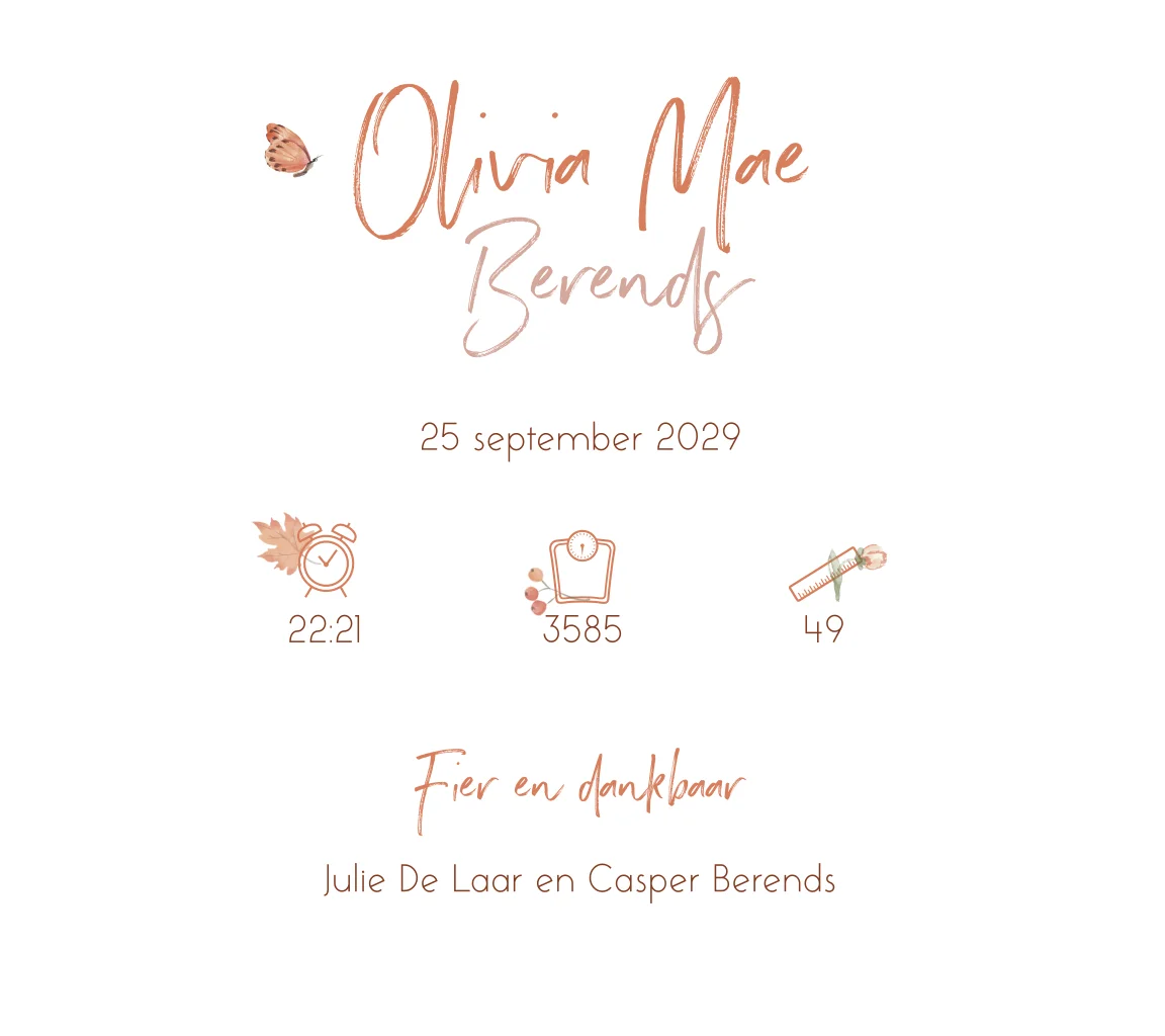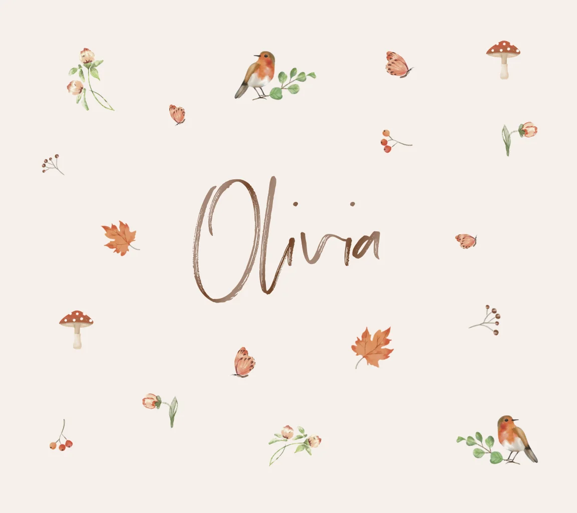 Wordt jullie dochtertje in de herfst geboren? Daar past dit lieve geboortekaartje in pastel-roze perfect bij! Op het kaartje staan herfstblaadjes, paddenstoelen, vlinders en roodborstjes. De naam staan in bijpassende hoogglans voor een extra luxe accent.