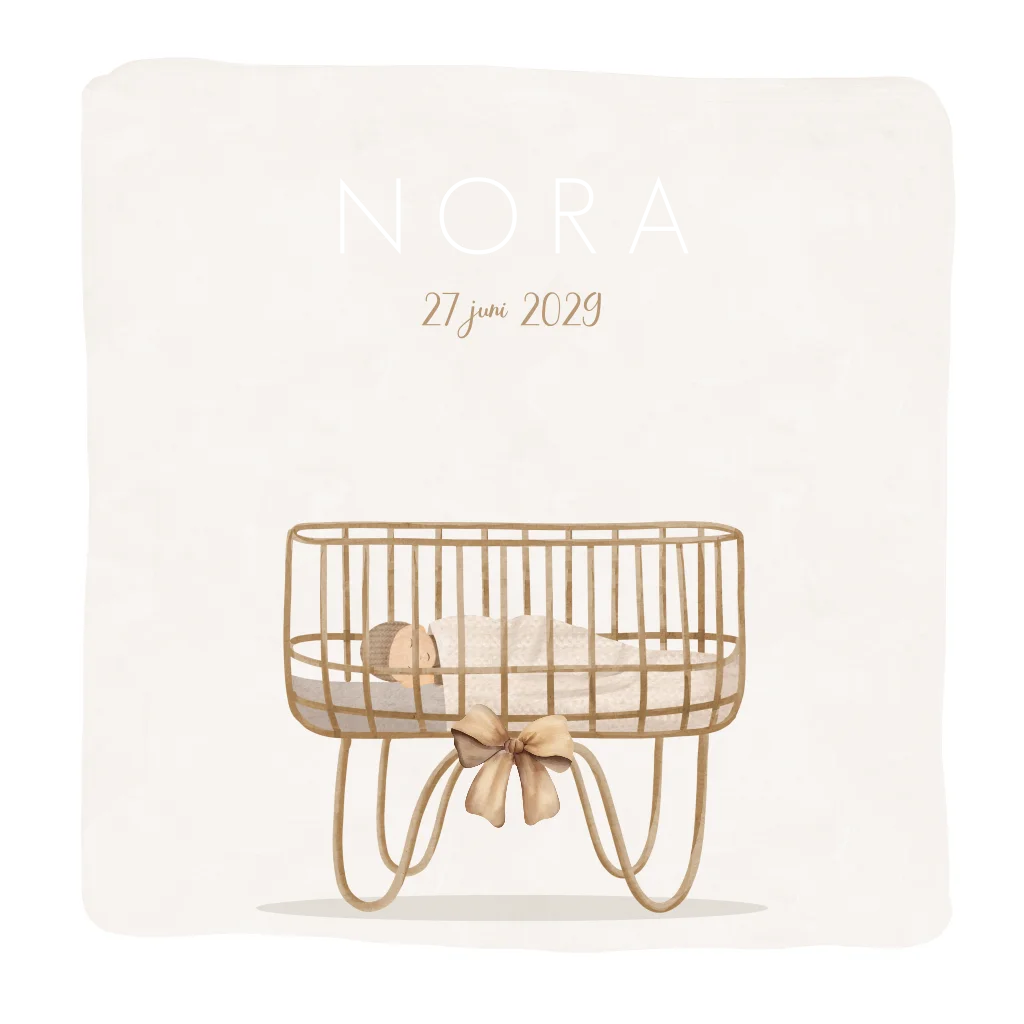 Een lief geboortekaartje voor jullie dochter. Het kaartje heeft een beige achtergrond met daarop een illustratie van een baby in een wiegje. De goudfolie letters geven het geheel een luxe uitstraling. Maak de kaart naar eigen wens in de online editor.