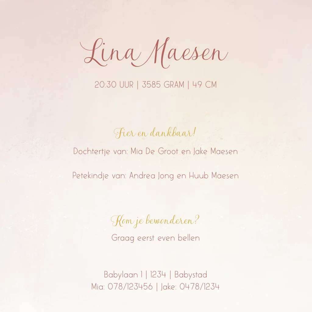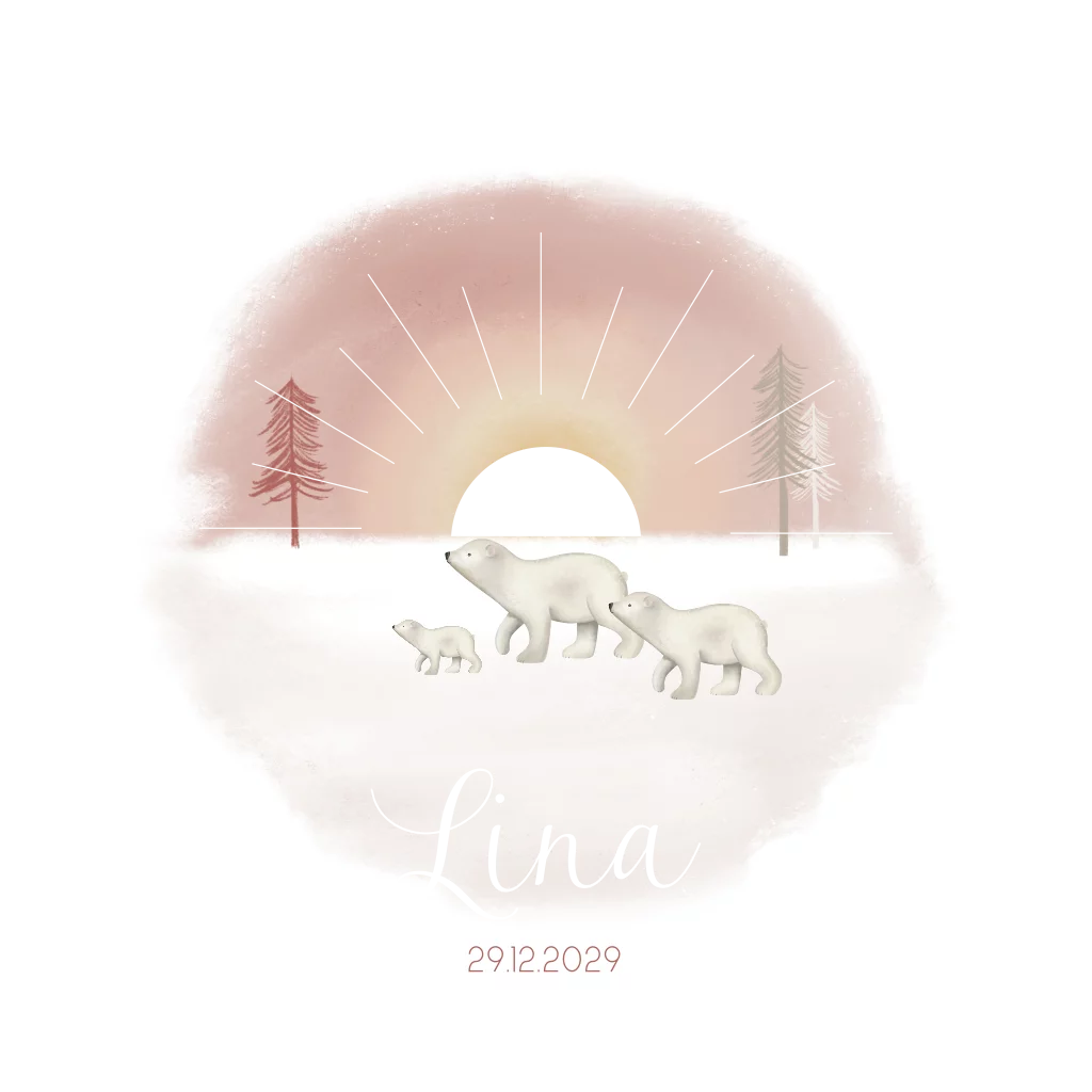 Lief geboortekaartje voor een meisje, leuk als jullie dochter in de winter geboren wordt! Op een achtergrond van roze aquarel met zon loopt een ijsberenfamilie in de sneeuw. De naam staat in luxe goudfolie, dat geeft een extra chic effect.