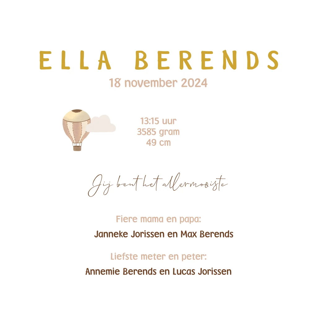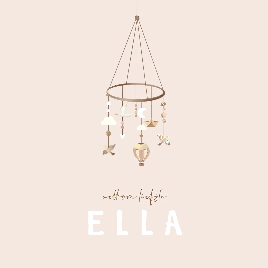 Lief roze geboortekaartje voor een meisje met een schattig mobiel. De zachte kleuren met de letters in goudfolie geven het een luxe uitstraling. Personaliseer in onze online editor.