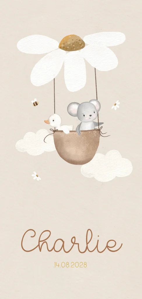 Lief geboortekaartje met schattige muis en eend in een bloem ballon. De zachte kleuren en de subtiele details maken het bijzonder stijlvol.