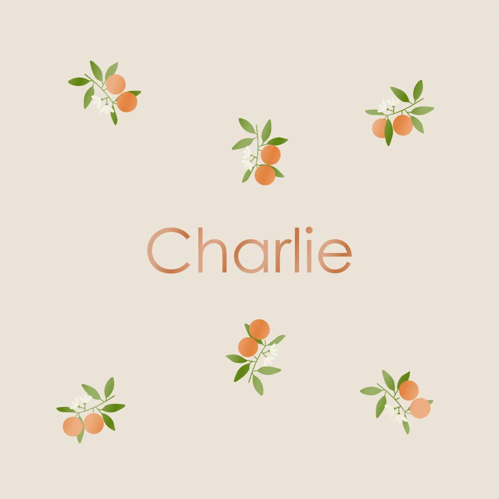 Lief geboortekaartje met een patroon van takjes met sinaasappeltjes op een beige achtergrond. Ook aan de binnenkant komt het design weer terug en de tekst is in bijpassende kleuren, pas deze eenvoudig zelf aan met hulp van de ontwerp tool.