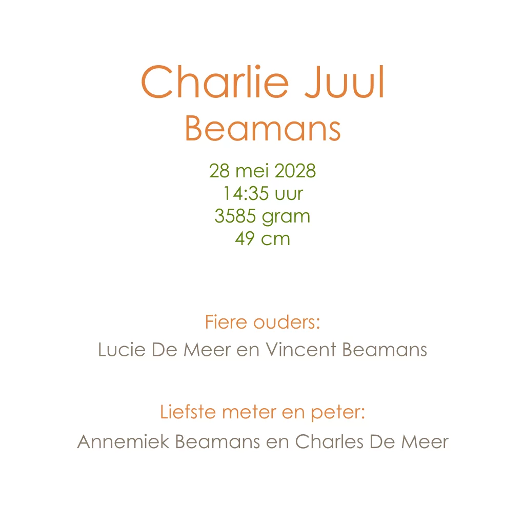 Geboortekaart sinaasappel met 3 kleuren uv lak