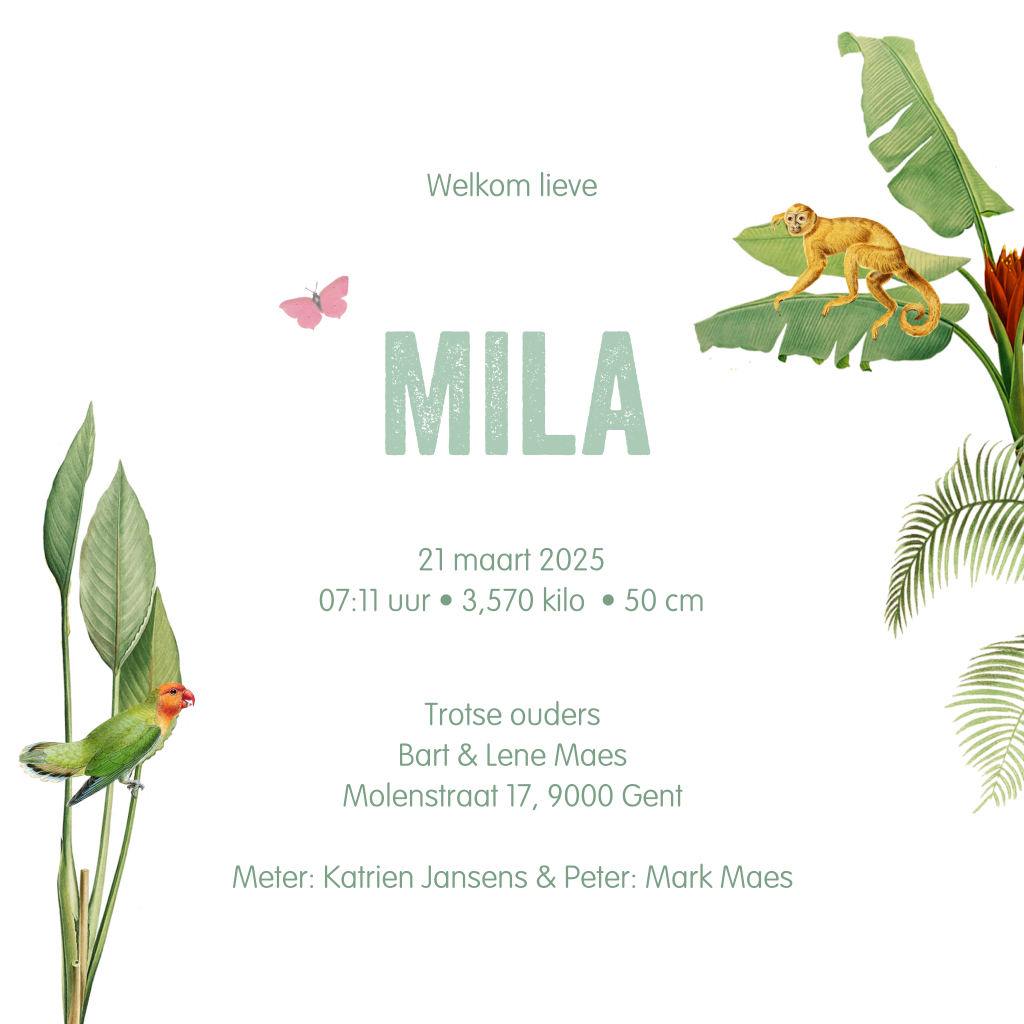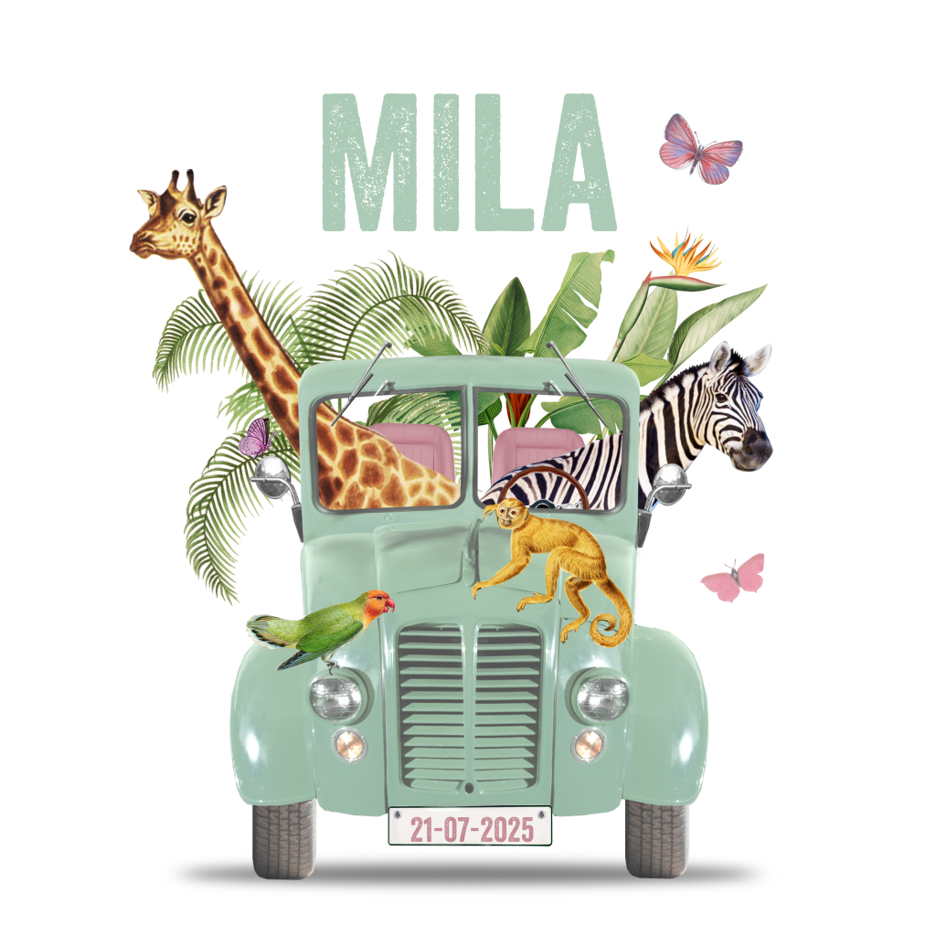 Grappig geboortekaartje in junglethema. Op het mintgroene kaartje een oldtimer bus met open dak. In en op de auto een giraffe, zebra, aapje en papegaai. Op de achtergrond vlinders en bladeren. Ook de binnenzijde van de kaart is geïllustreerd in junglethema. Op het nummerbord kun je zelf de tekst vervangen door de geboortedatum van jullie kleine!