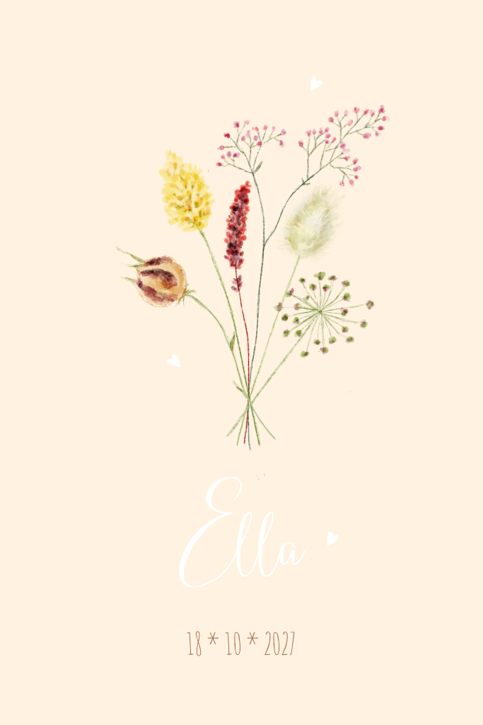 Een hip geboortekaartje voor een meisje met een boeketje veldbloemen met hartjes erboven op zachtgeel. Mooie letters in roségoudfolie maken het kaartje helemaal af.