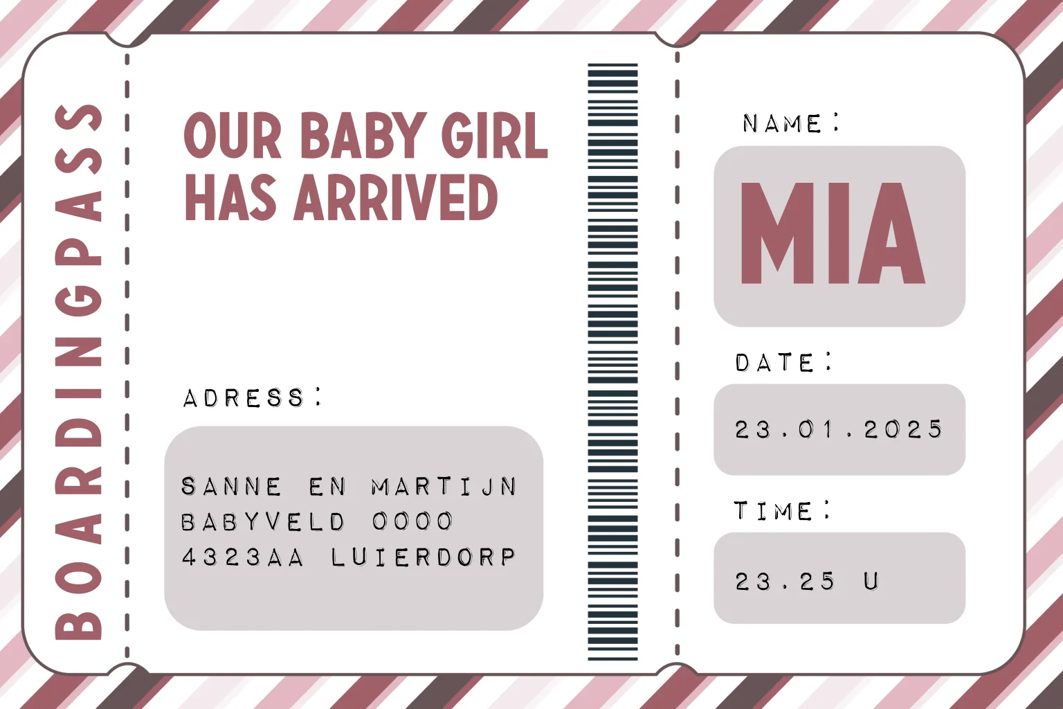 Origineel geboortekaartje voor een meisje in de vorm van een boarding pass. De achtergrond is in schuine strepen in verschillende kleuren roze. Op de tekst-vlakken staan verschillende lettertypes, ga zelf aan de slag in de editor en maak het kaartje helemaal naar wens met persoonlijke tekst.
