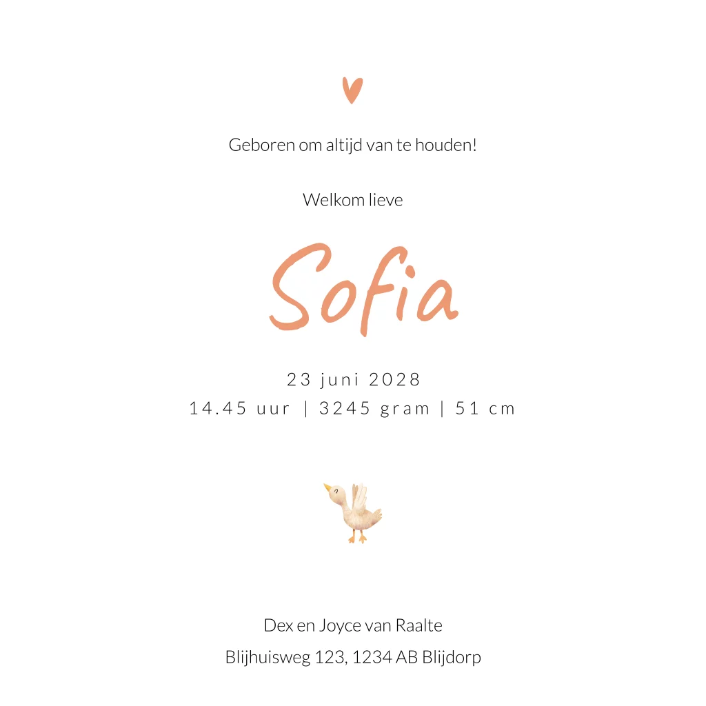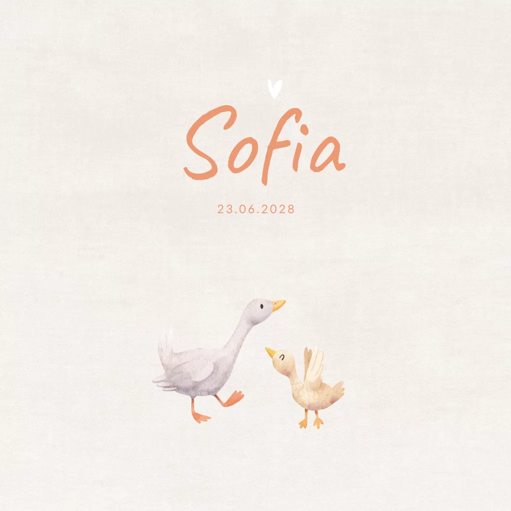 Schattig geboortekaartje met dansende gansjes in het klein en groot. Een vrolijk geboortekaartje voor jullie kleintje.