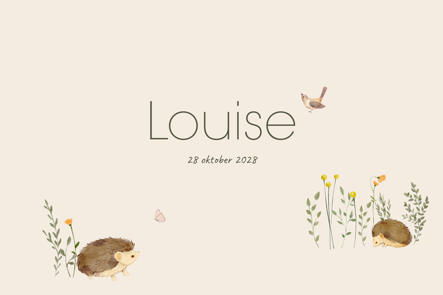 Lief neutraal geboortekaartje met egeltjes, bloemetjes, takjes en vlindertjes. Pas het kaartje naar wens aan in de online editor!