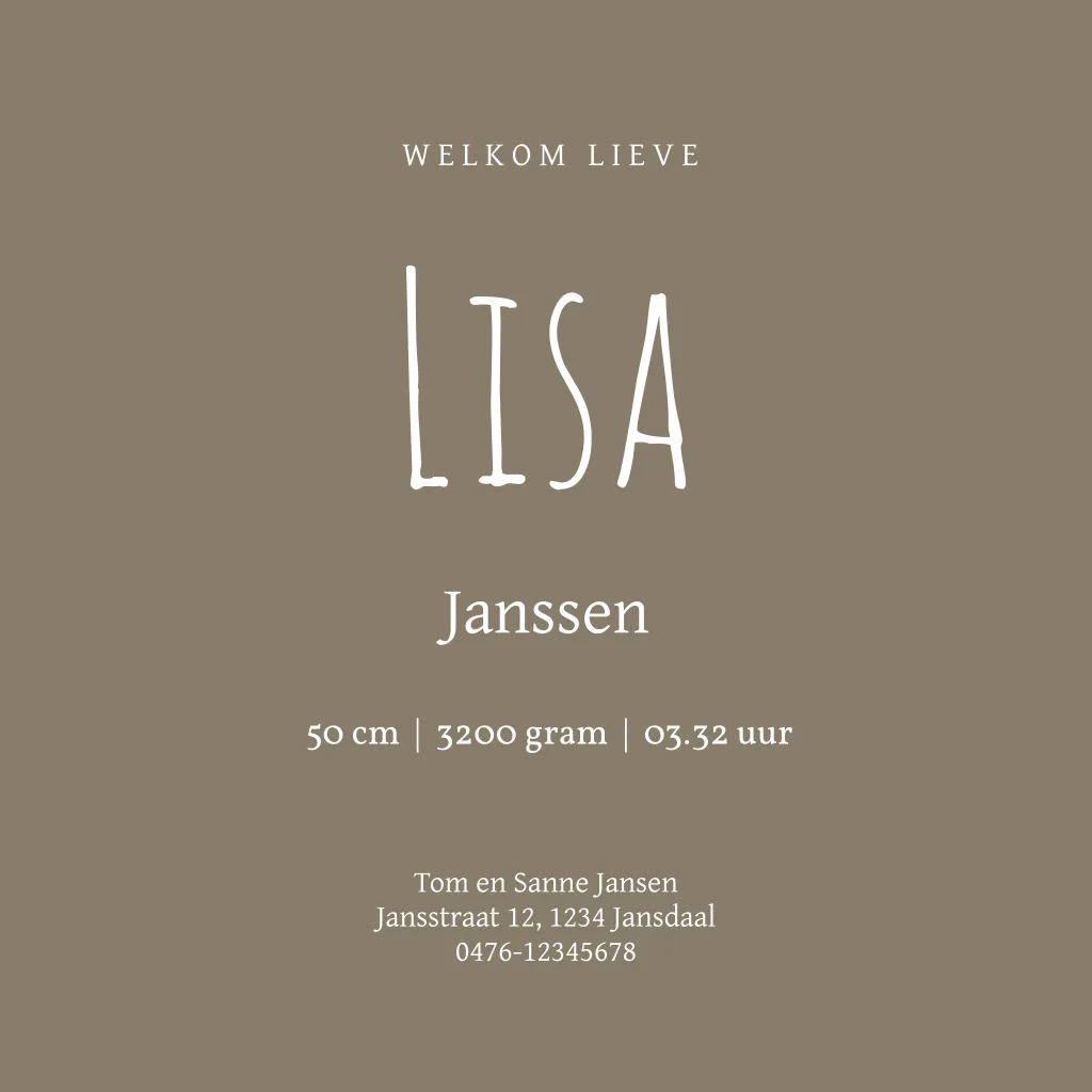 Stoer geboortekaartje in natuurtinten voor een meisje met een leuke illustratie van een giraffe met een vlinder erboven. De tekst staat in witte trendy letters en is eenvoudig zelf aan te passen in de online editor.