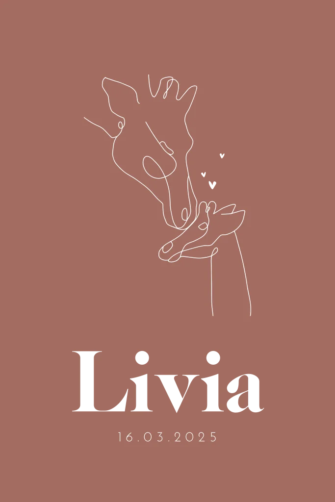 Lief geboortekaartje waarop je een giraffe ziet die een kusje geeft op de kop van haar baby-giraffe. De giraffes zijn op een hippe manier met een lijntekening op de geboortekaart gezet en wat extra leuk is: de tekst is in roségoudfolie gezet.Bekijk ook ons babyborrelkaartje.