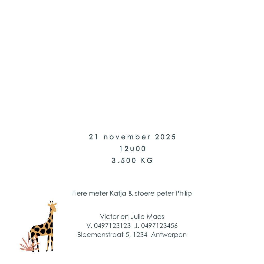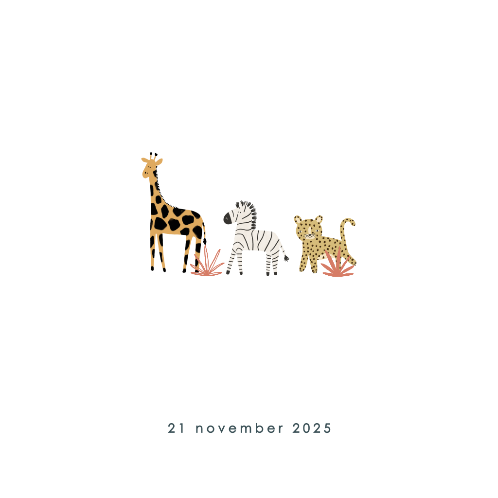 Een vierkant geboortekaartje met jungledieren zoals een giraffe, een zebra en een tijgertje. Enkele details zijn van roségoudfolie.| Totaalprijs: 0 |