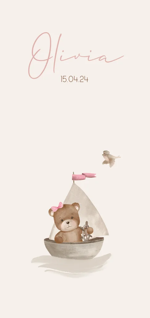 Dit langwerpige geboortekaartje met rustige en lieve uitstraling is perfect voor jullie pasgeboren dochtertje. Op de beige achtergrond staat de naam van jullie kleintje in sierlijk roze letters. Daaronder vaart een beertje in een bootje met roze accenten.