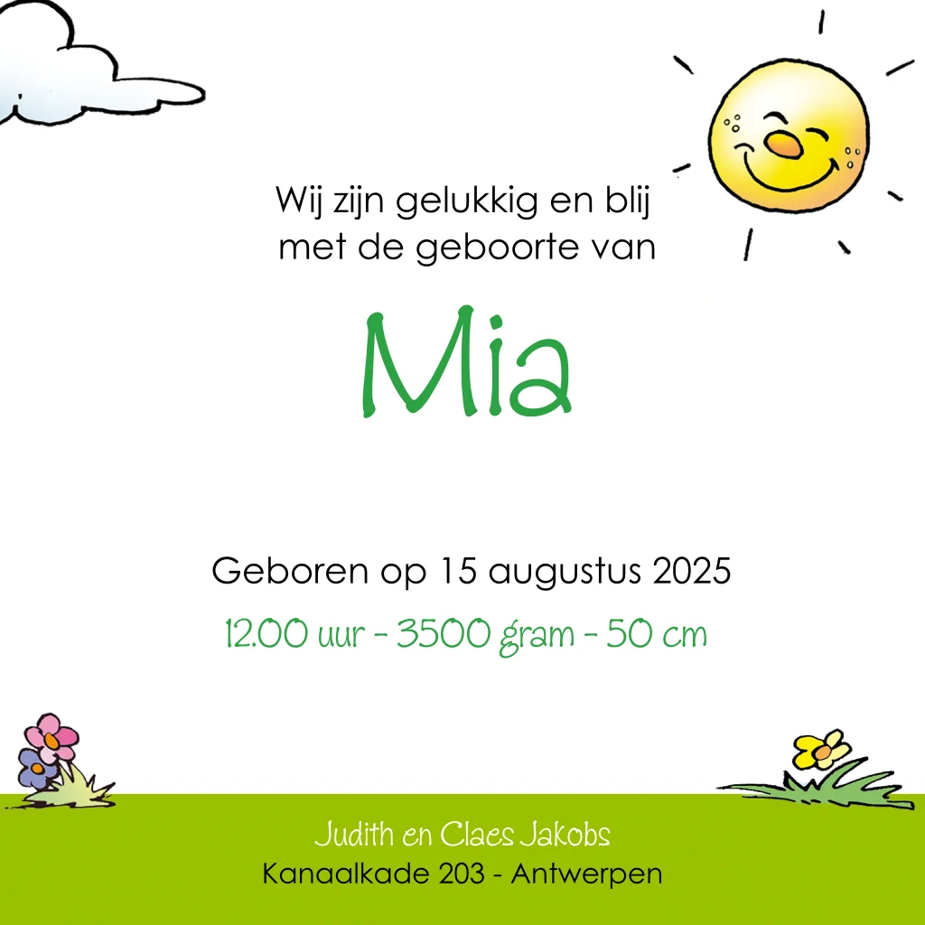 Een cartoon van een baby op een navigatie-ooievaar: wat origineel en grappig! Met de wolkjes en het vrolijke zonnetje erbij is hij helemaal compleet. Leuk voor een meisje! Alleen nog even eigen tekst toevoegen in de online editor en het kaartje is klaar voor verzending.