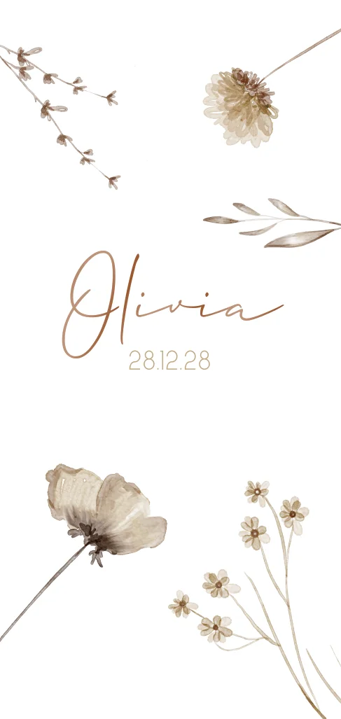Elegant geboortekaartje voor een meisje met verschillende droogbloemen op een witte achtergrond. Laat de naam van jullie kleintje glinsteren in glansfolie.