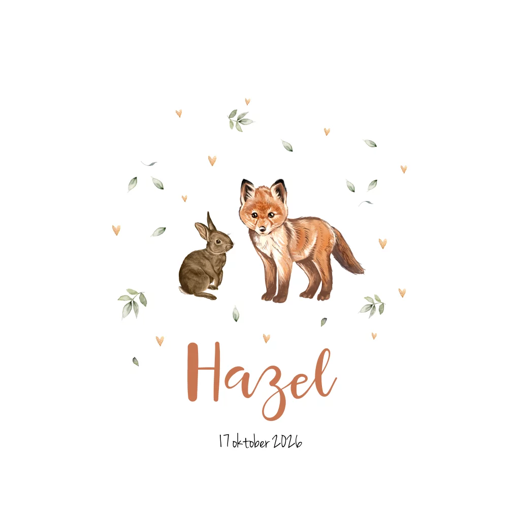 Wordt jullie dochtertje in de herfst geboren? Dit schattige kaartje met bosdieren past daar perfect bij! Op het witte kaartje zit een konijntje met een vosje ernaast, de herfstblaadjes dwarrelen er vrolijk omheen.