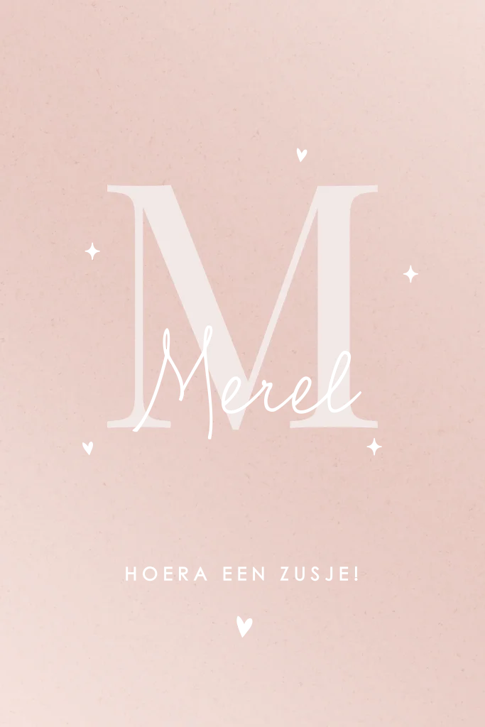 Hip geboortekaartje voor een meisje met het initiaal van jullie kindje op de voorkant van de kaart. De details op het kaartje zijn van roségoudfolie.