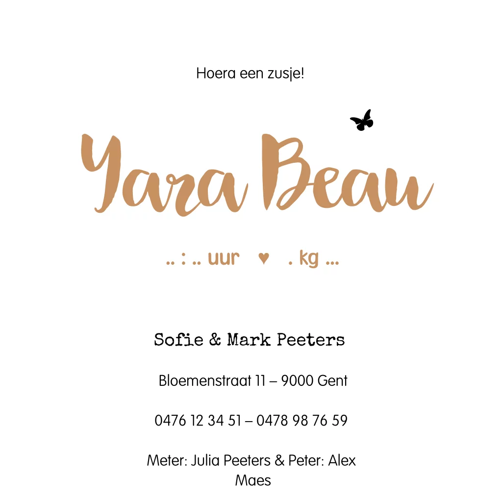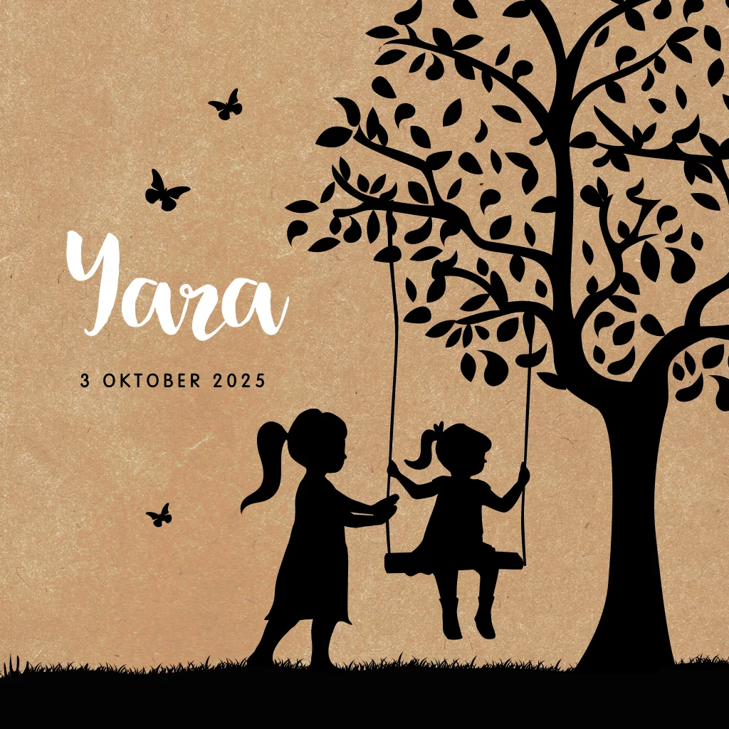 Hip geboortekaartje voor een meisje op kraft-look. Op het vierkante kaartje staat het silhouet van twee zusjes op de schommel in een landschap met een boom. Hier en daar vrolijk rondfladderende vlindertjes. In de online editor maak je dit trendy kaartje helemaal naar eigen wens.Bekijk ook ons babyborrelkaartje.