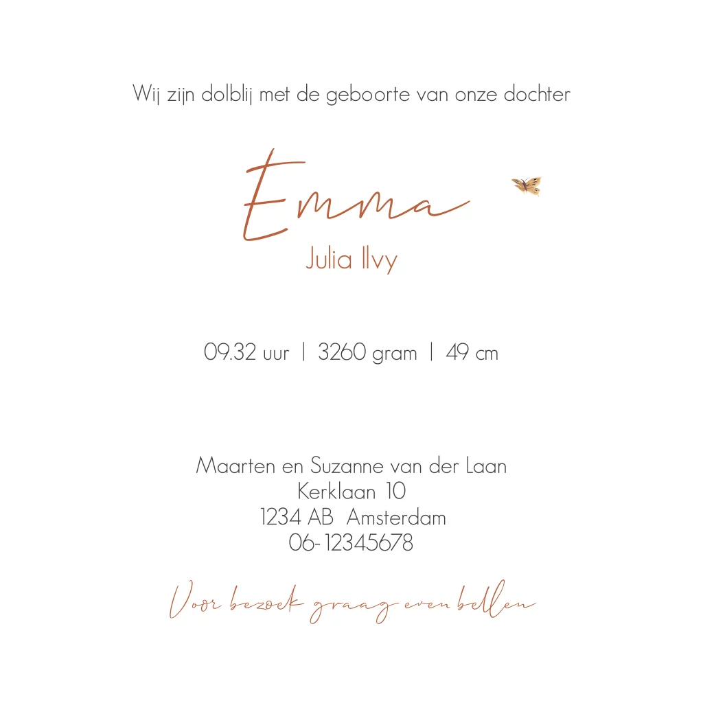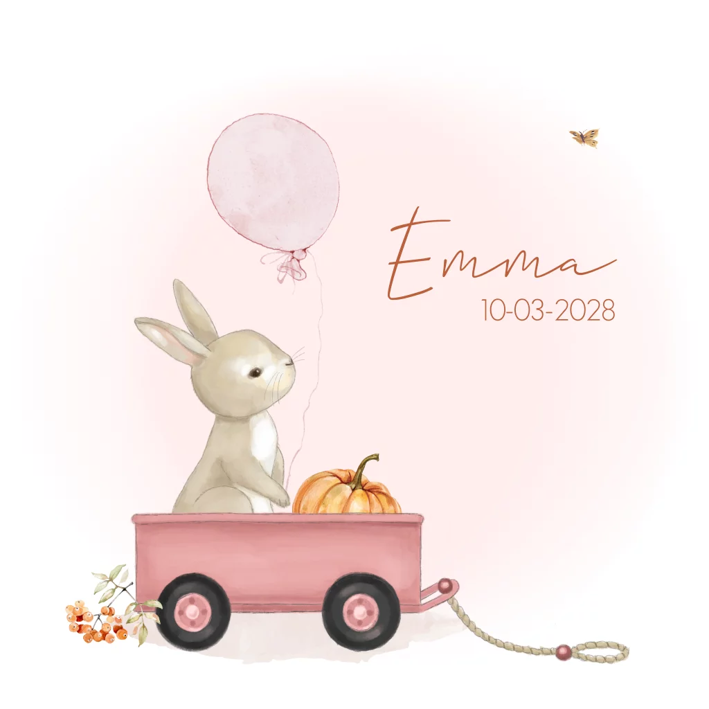 Schattig, dit geboortekaartje voor een meisje met roze waterverfachtergrond! In de bolderkar zit een lief konijntje met een pompoen en een ballon erboven. Leuk kaartje als jullie dochtertje in de herfst wordt geboren!