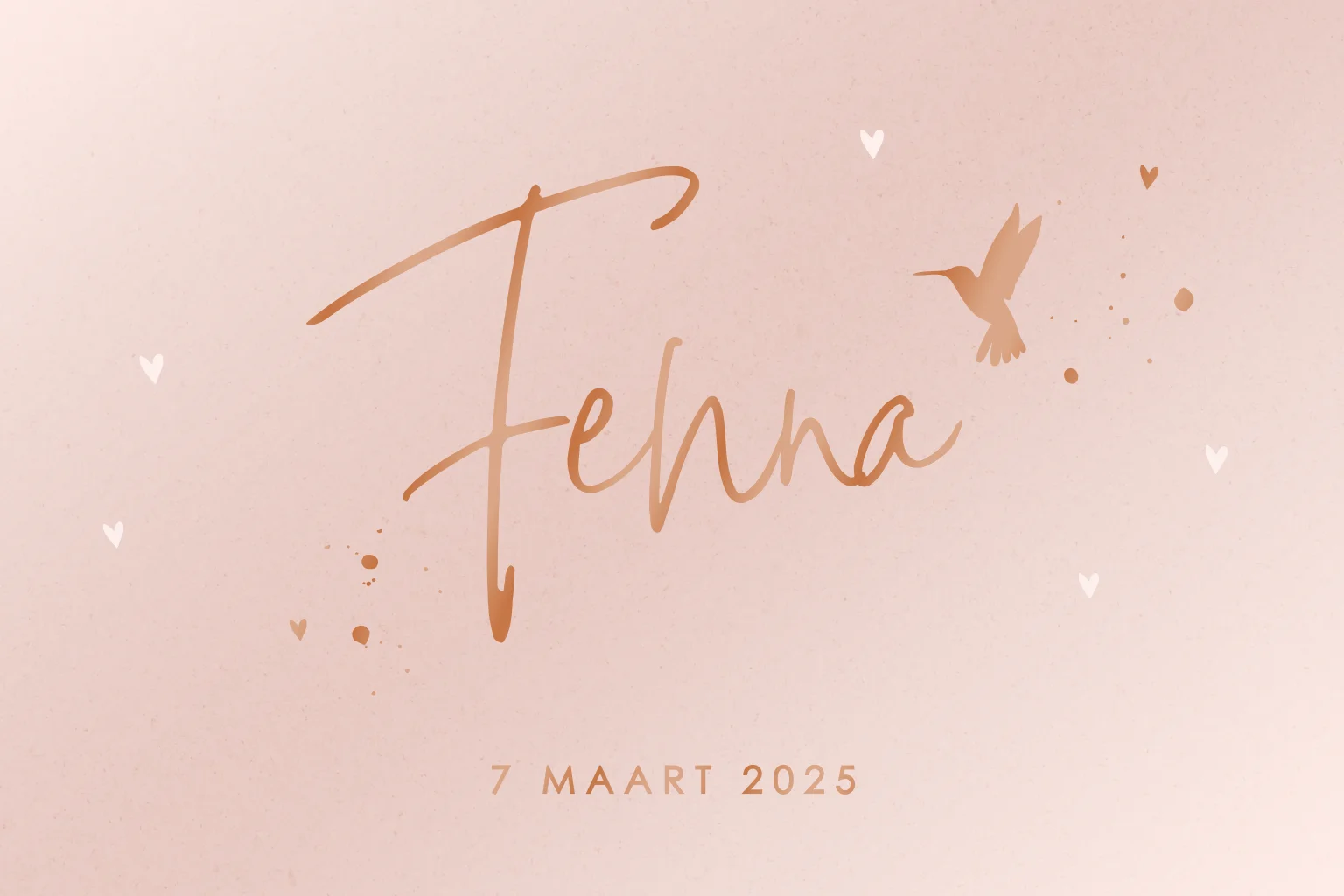 Trendy en lief babykaartje voor een meisje. Op het kaartje staan details van roségoudfolie zoals de naam en een kolibrie. Het kaartje is helemaal naar wens aan te passen in de online editor.