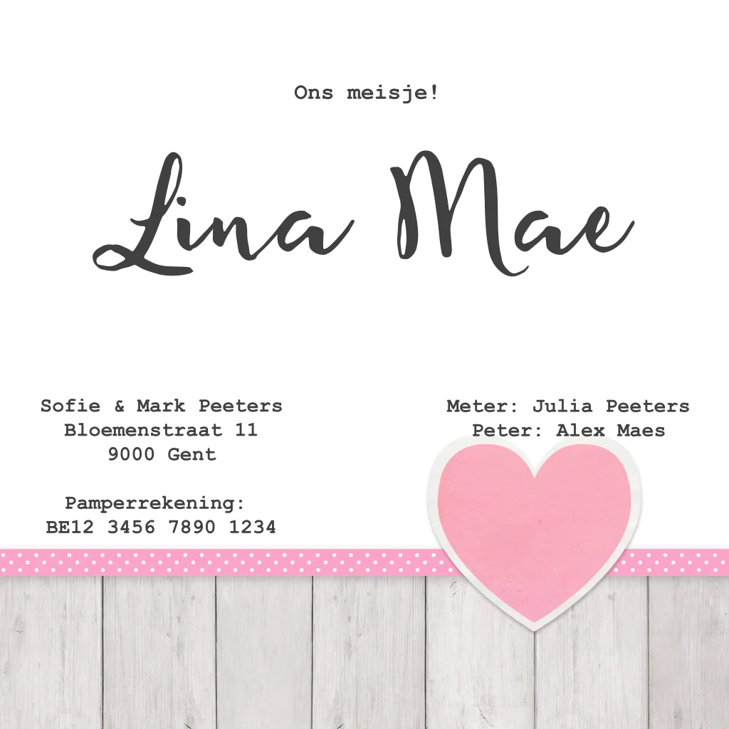 Trendy geboortekaartje met roze hartje, eigen foto, houtachtergrond en toffe afbeeldingen voor de tijd, het gewicht en de lengte van de baby. Maak hem persoonlijk in de online editor en combineer hem met een bijpassende enveloppe!Bekijk het bijpassende babyborrelkaartje.